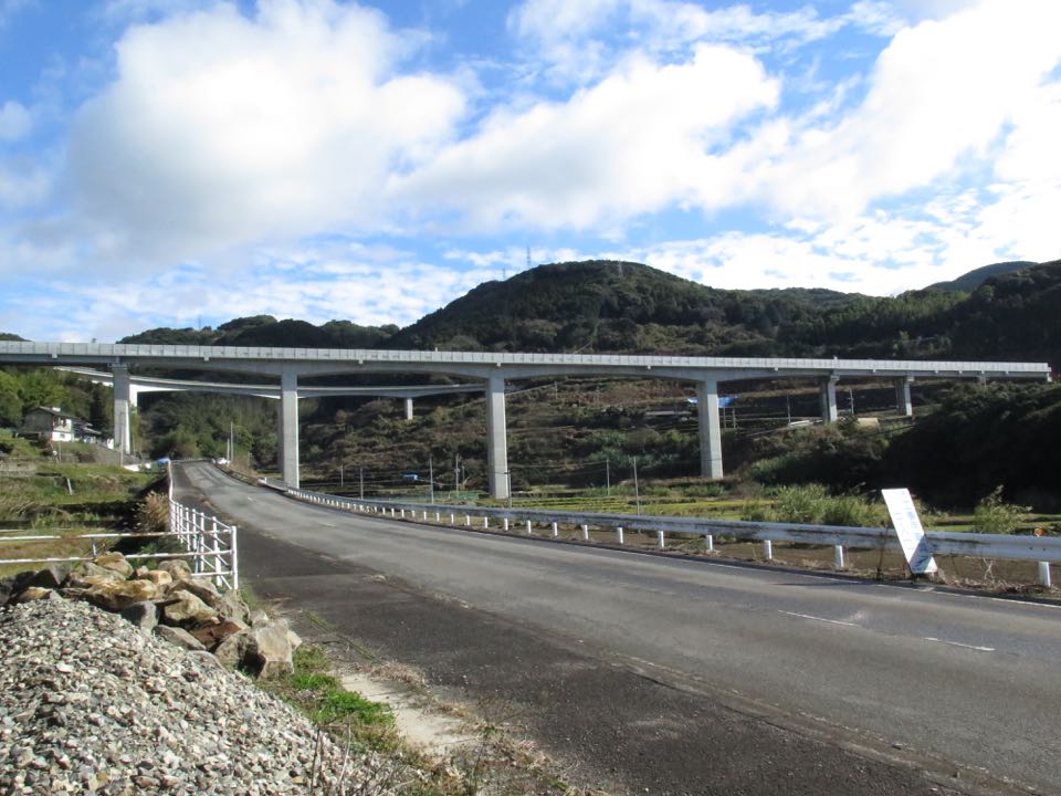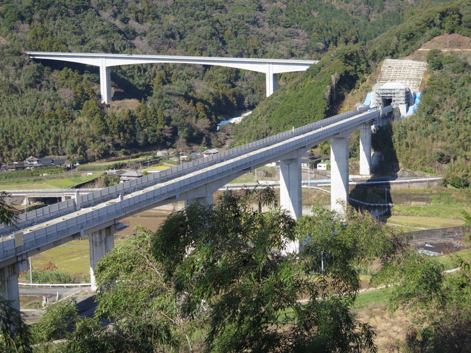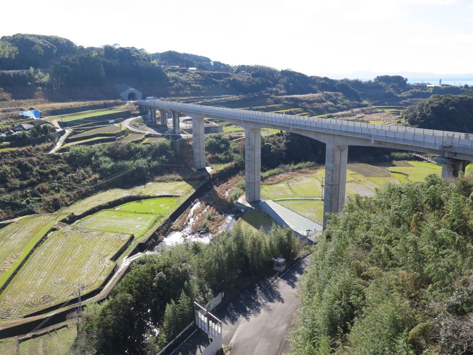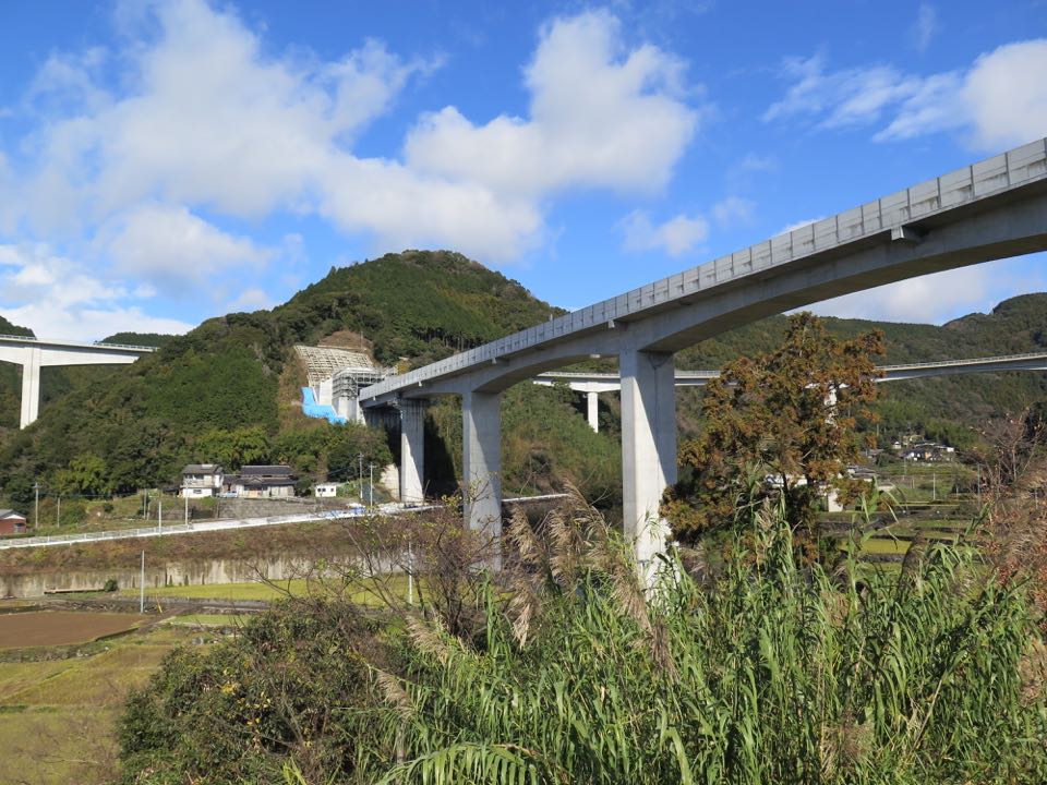 東彼杵町の千綿川にかかる橋梁です。博多方の塩鶴トンネル(L=345m・貫通済)南側坑口が見えます。奥の雄大な橋は、広域農道・大村湾グリーンロードです。 |
