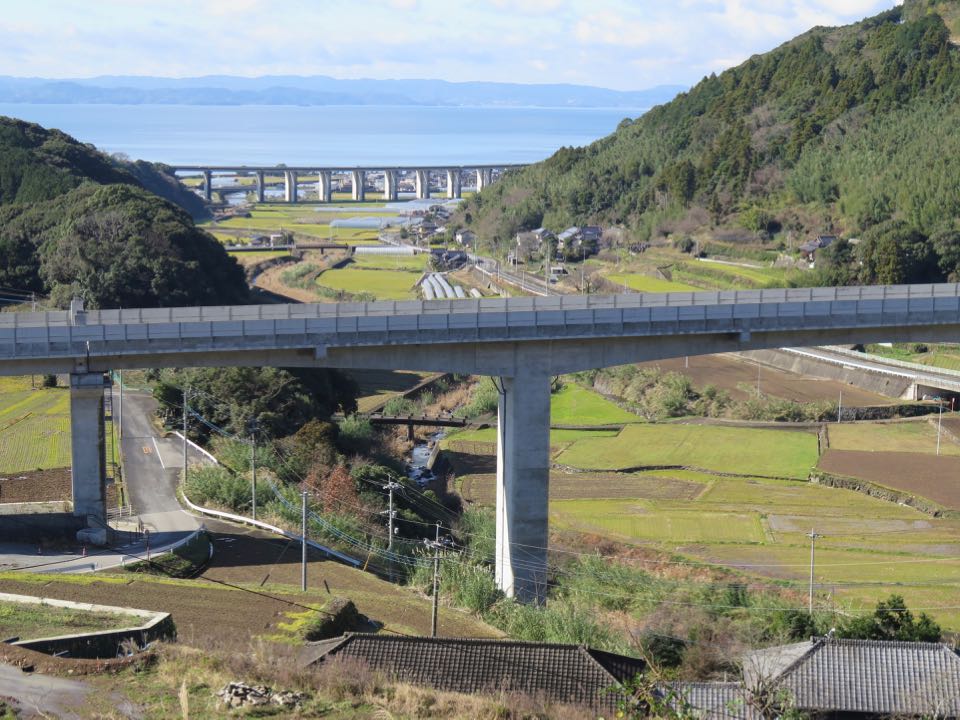大村湾グリーンロードの展望台から、千綿トンネル北側坑口を見ます。 |