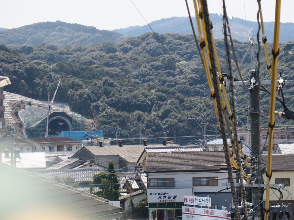 1枚目の写真の地点から、工区全体を見ることができますが、まだ一部でしか工事が始まっていません。奥に橋脚と、第1平山トンネルの坑口が見えます。