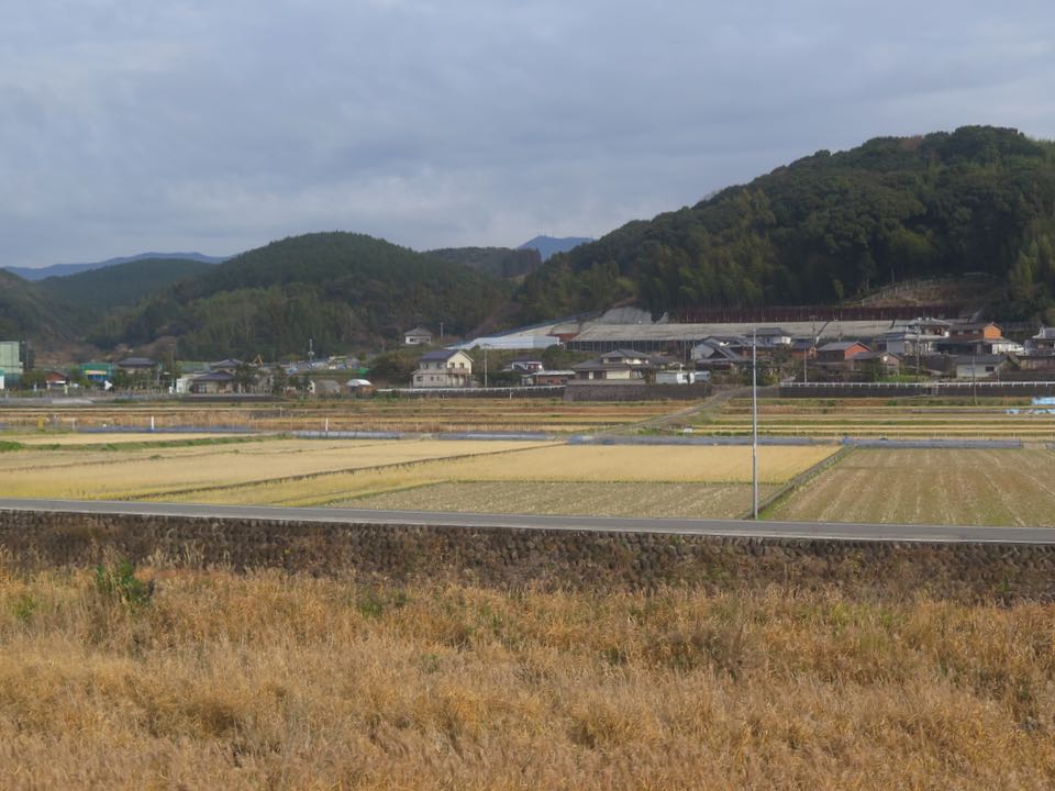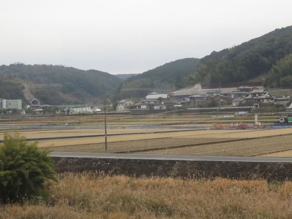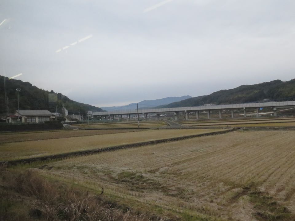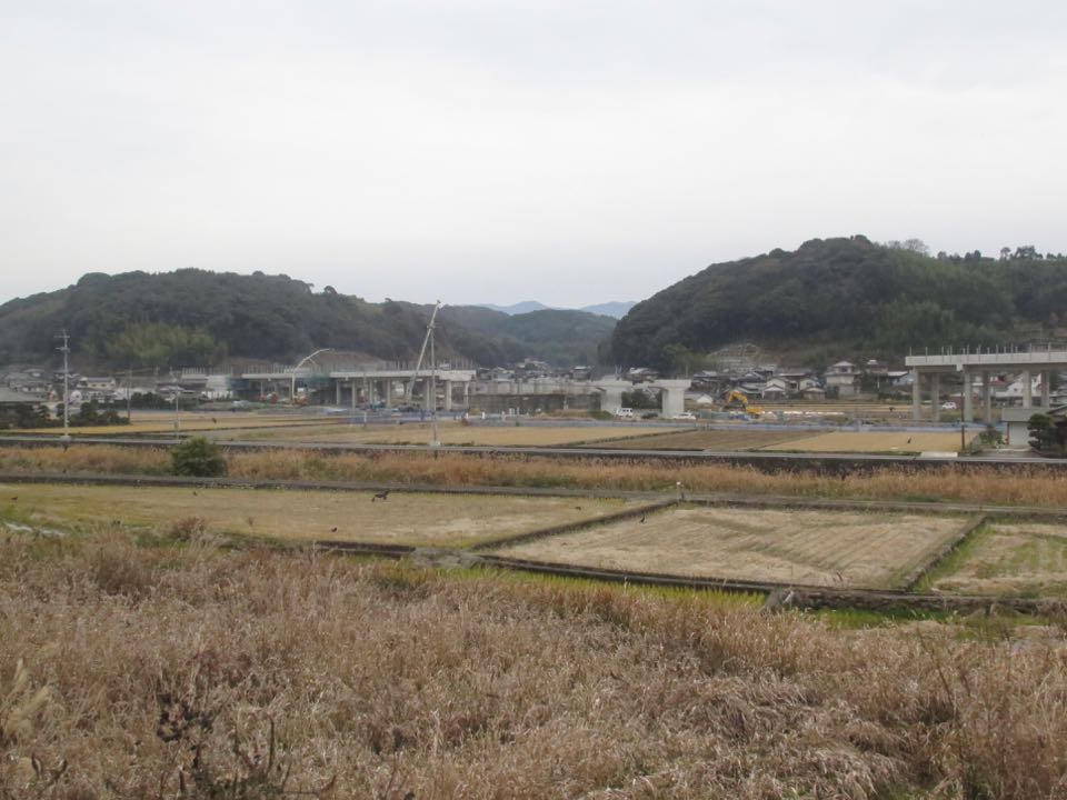奥に見える山肌に、第1本明トンネル〜第2本明トンネル間の土工区間が見えます。