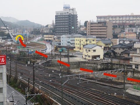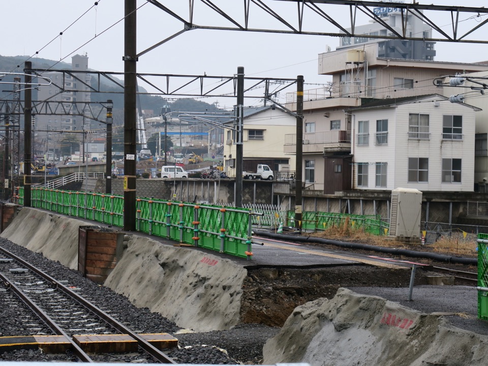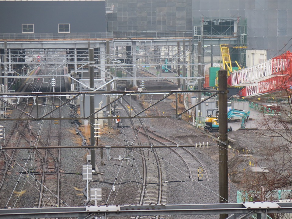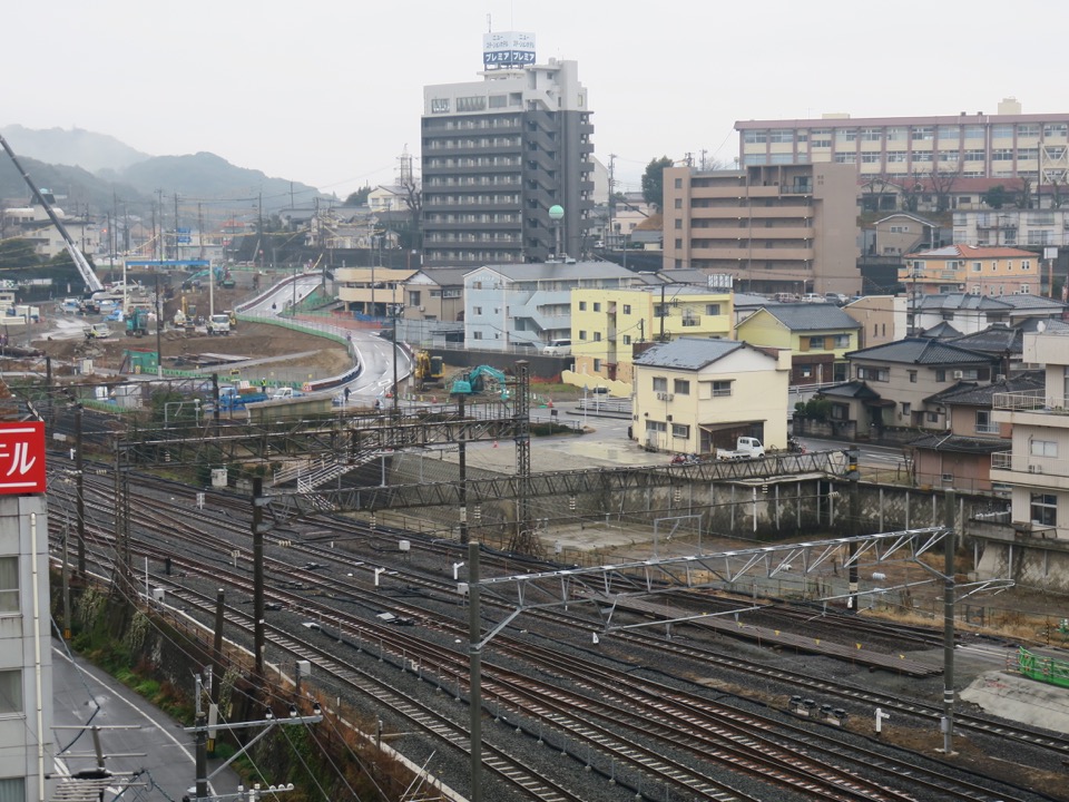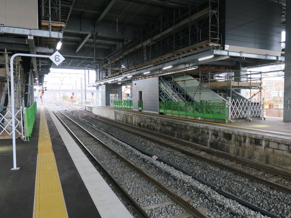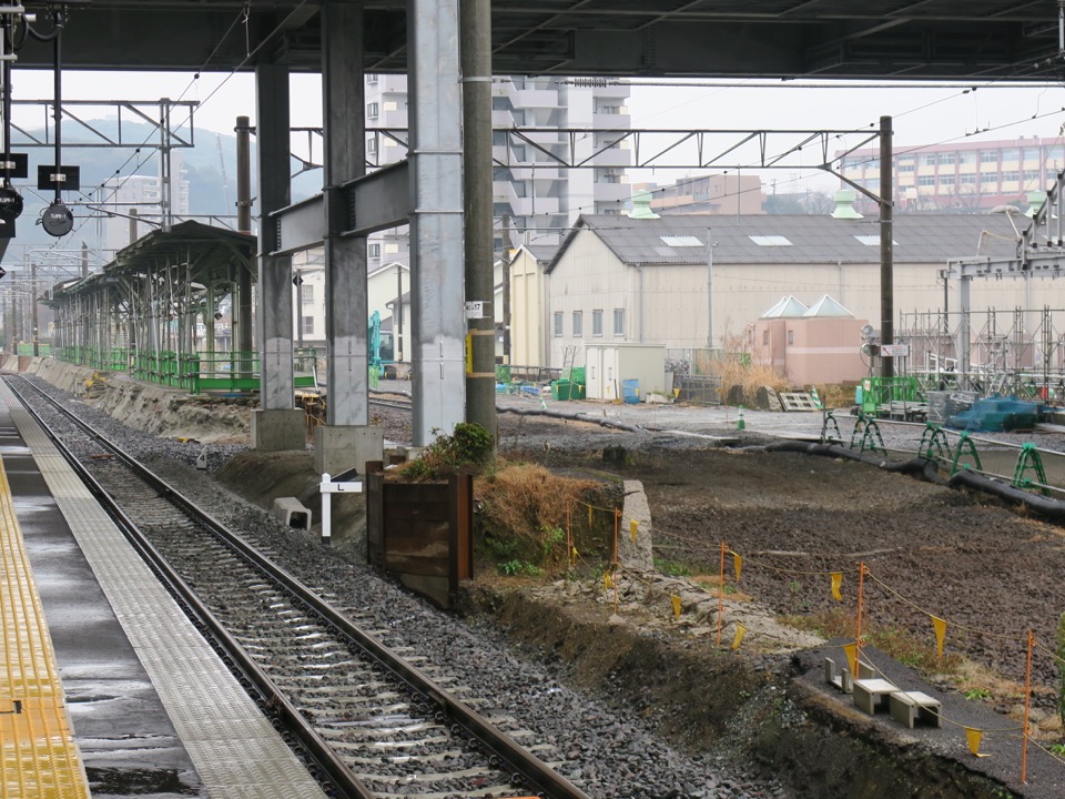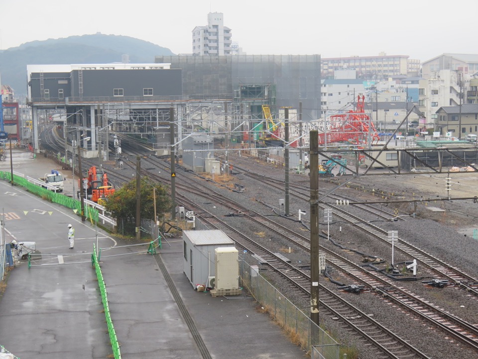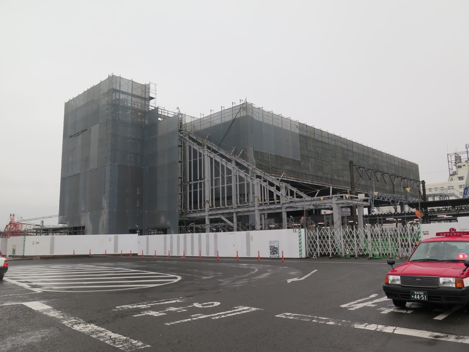 駅東口。現在仮駅舎で営業中ですが、他駅に先んじて、既に橋上駅舎が姿を見せています。東西を結ぶ線路下通路が少なくとも2つ、新幹線工事に支障して閉鎖されるので、新駅舎を早々に作って自由通路を開通させてしまえ、ということですね。 |