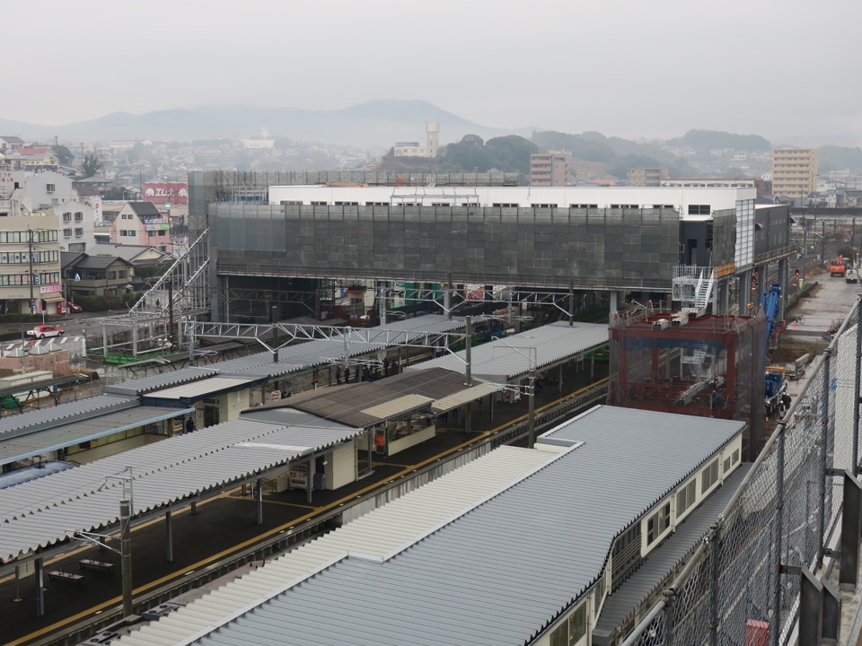 駅の西口です。現在はありませんが、新駅舎への階段が姿を現しています。新幹線開業に伴い、新たな出入口が設置されるのは、久留米に似ています。 |
