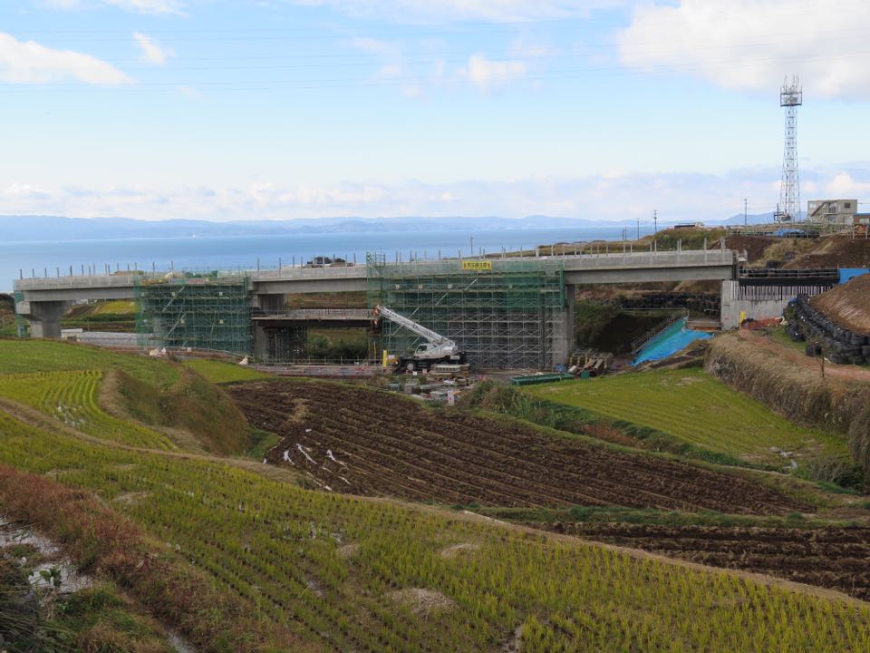 東に回り込み、少し標高の高いところから見下ろします。谷をまたぐのは変配川橋梁です。いわゆる「やじろべえ」のように、橋脚から左右均等に伸ばす工法が採られています。 |