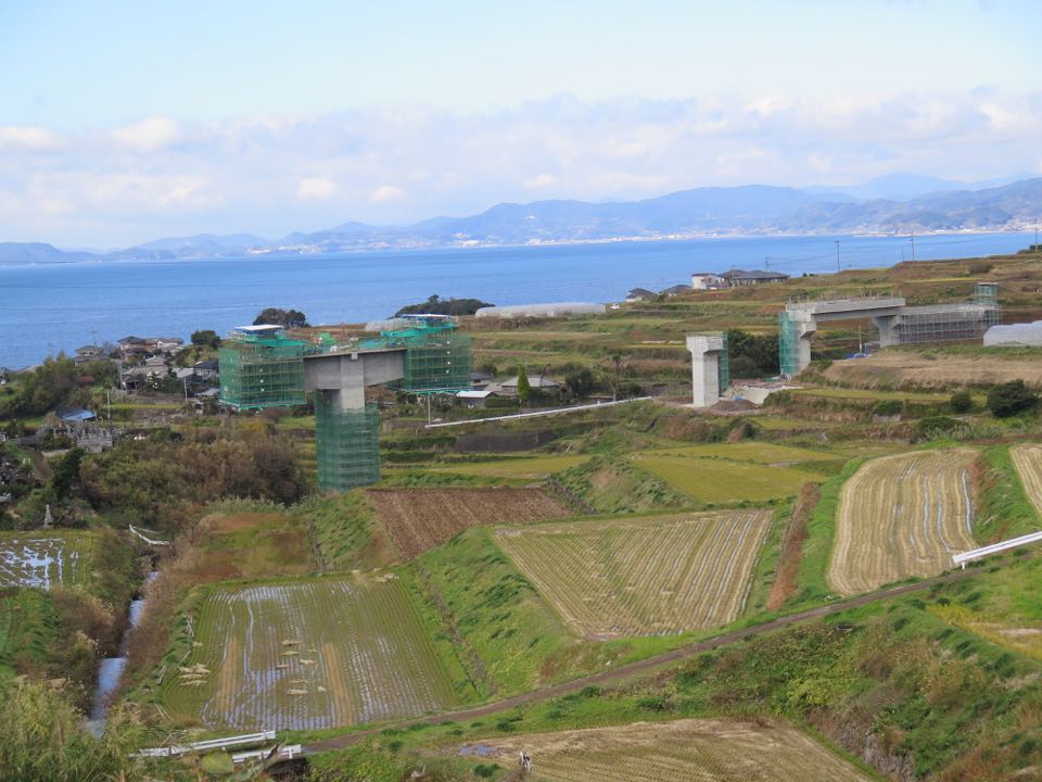 松原トンネルのほぼ真上から。長崎空港のある箕島が見えます。 |
