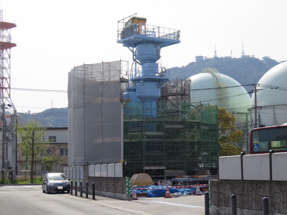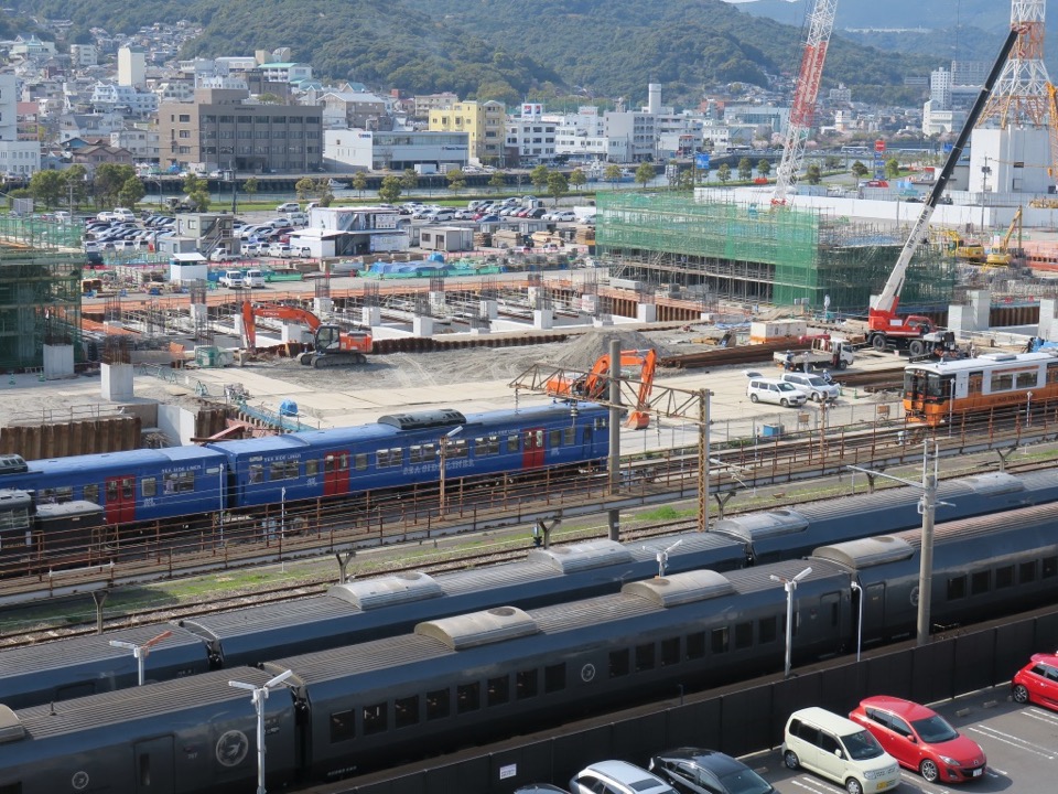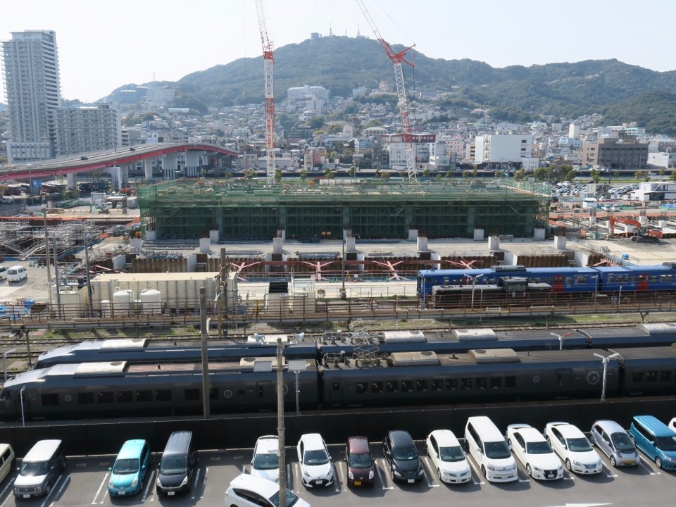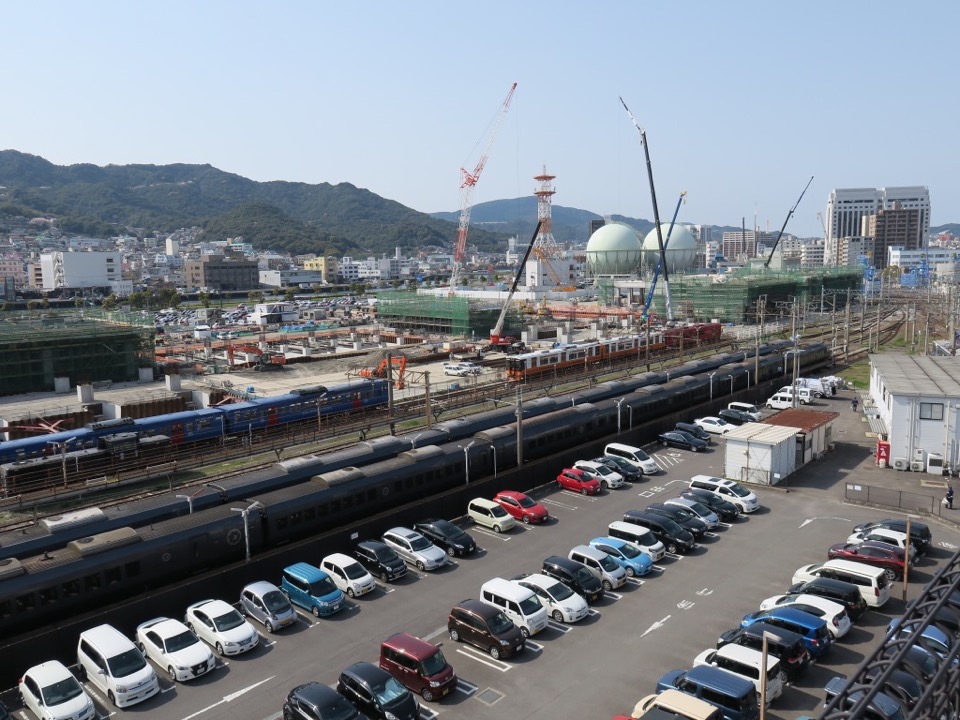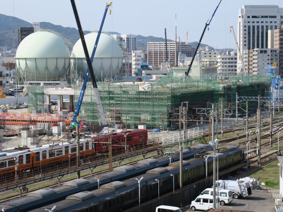 青い橋脚のようなものが4連設置されています。これらは恐らく橋脚本体ではなく、掘削と地盤改良を並行して行う施設のように思われます。県営バス敷地に2基・在来線を跨ぐ部分に2基設置されています。 |