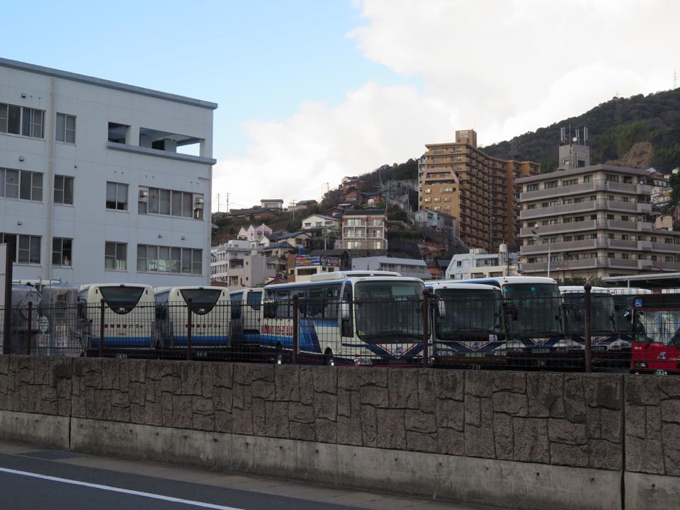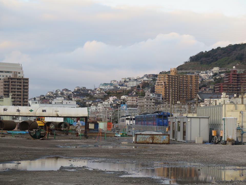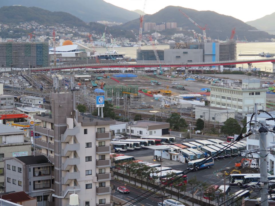 新長崎トンネル坑口の上から、長崎駅方を見ます。県営バスの駐車場が見えますが、ルートはその敷地の対角線を描くように横切ります。その奥には、既に橋脚が立ち上がり始めているのが分かります。 |