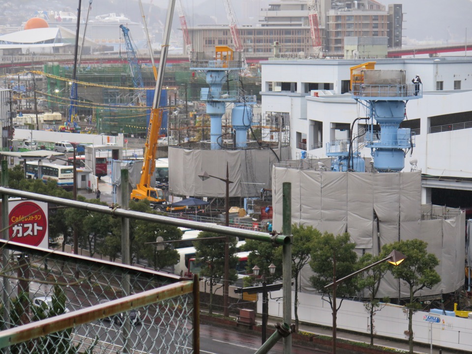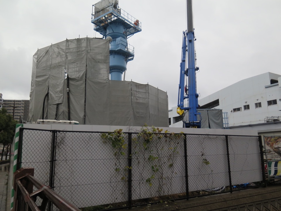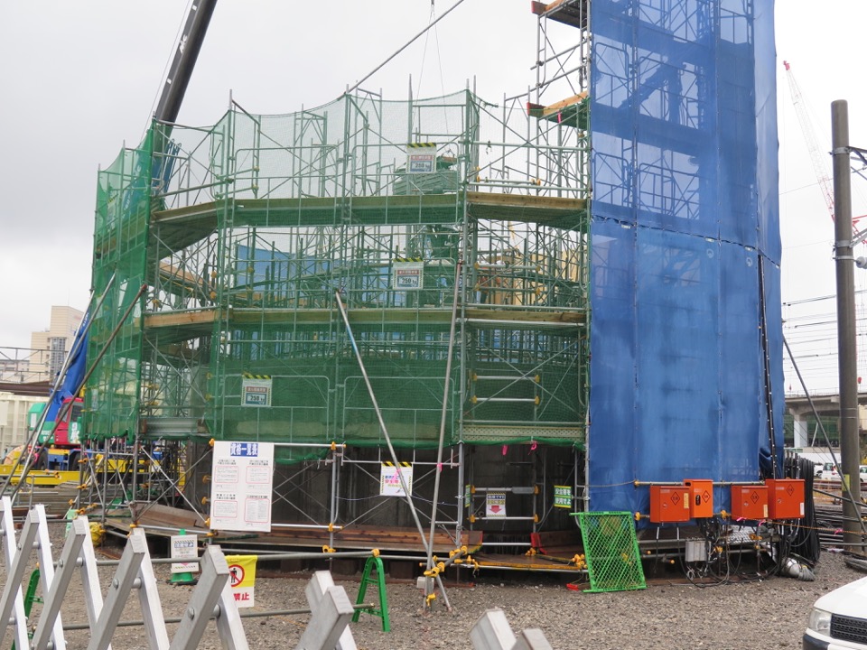 県営バス敷地に建造中の、2基の橋脚? 手前の宝町橋りょう(合成けた)設置の基地にもなると思われます。 |