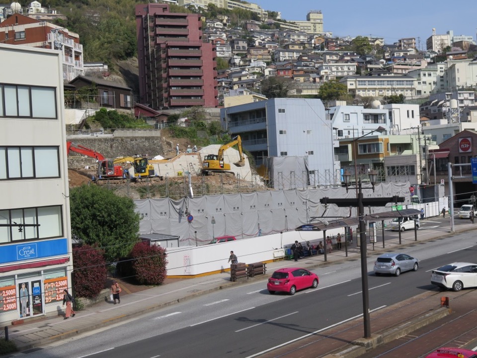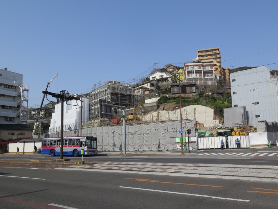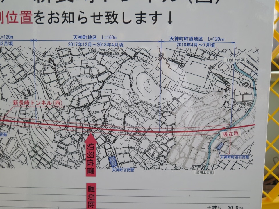 新長崎トンネル西工区の長崎方坑口は、斜面の住宅地に設けられます。ルートは手前に向かって、宝町バス停のほぼ真上を架道橋で通っていきます。坑口付近の建物解体が進んでいます。 |