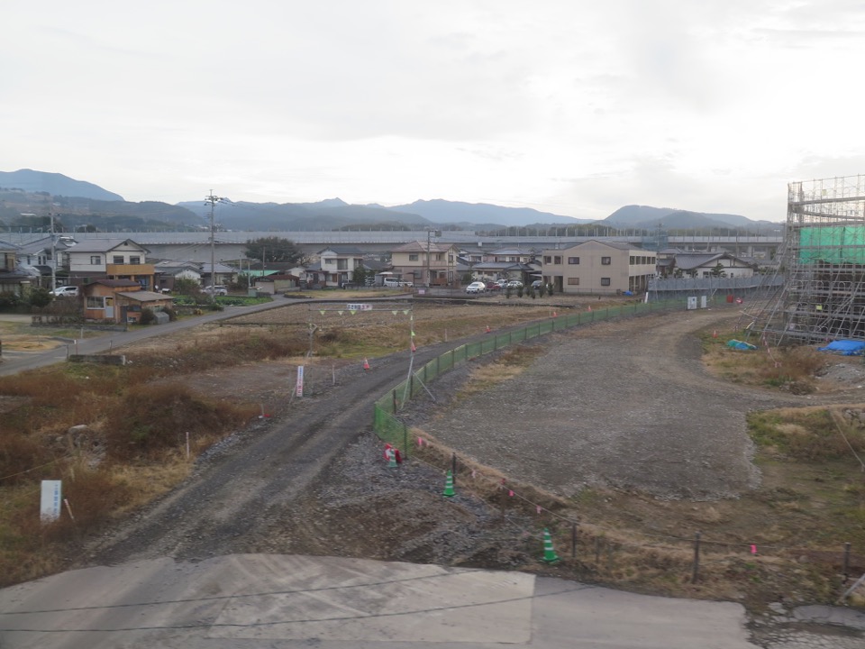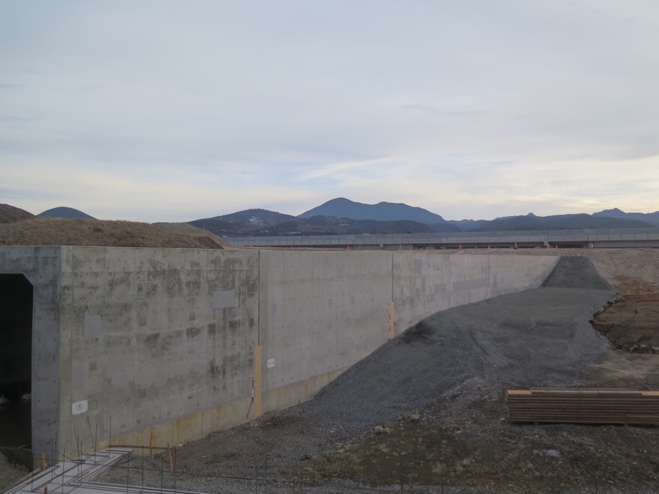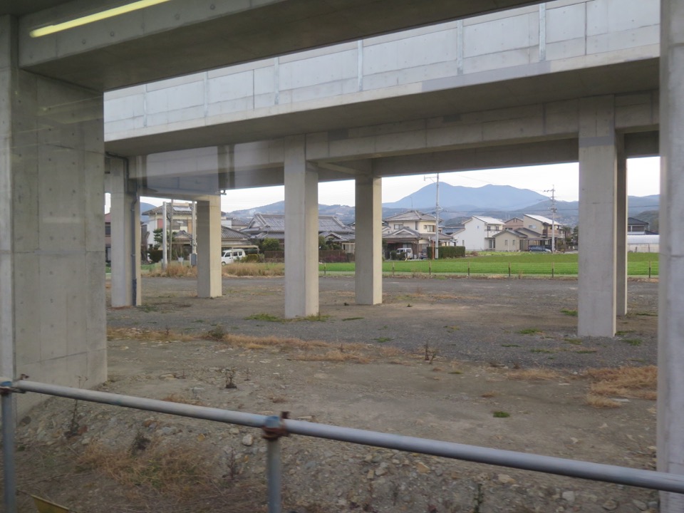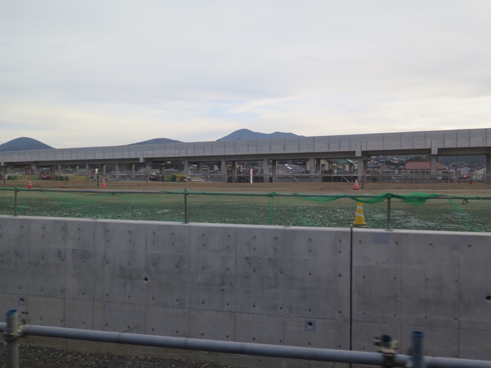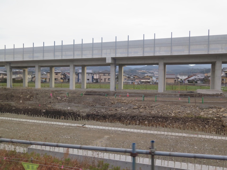 基地用地には高い盛り土が築かれています。これはおそらく、地盤改良のための「プレロード工法」でしょう。車両基地には、大きな床面積を持つ建造物が必要ですから、不等沈下が大敵です。そこで、地盤があまり強固ではない箇所では、建造物の着手前に予め土を盛り、その重力で基礎地盤の圧密沈下を促しつつ、強度を増加させます。今まで、いくつかの新幹線車両基地において、同様の工法が採用されてきました。 向こう側に完成した竹松高架橋が見えます。 |
