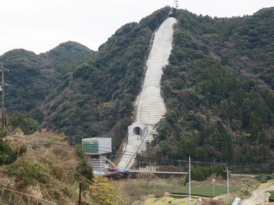 三ノ瀬トンネルの武雄温泉方坑口です。山体の防護は、比高100メートルを越えています。