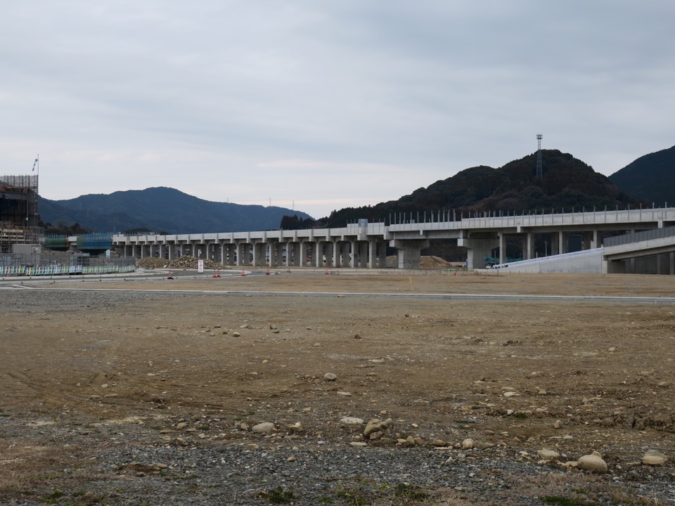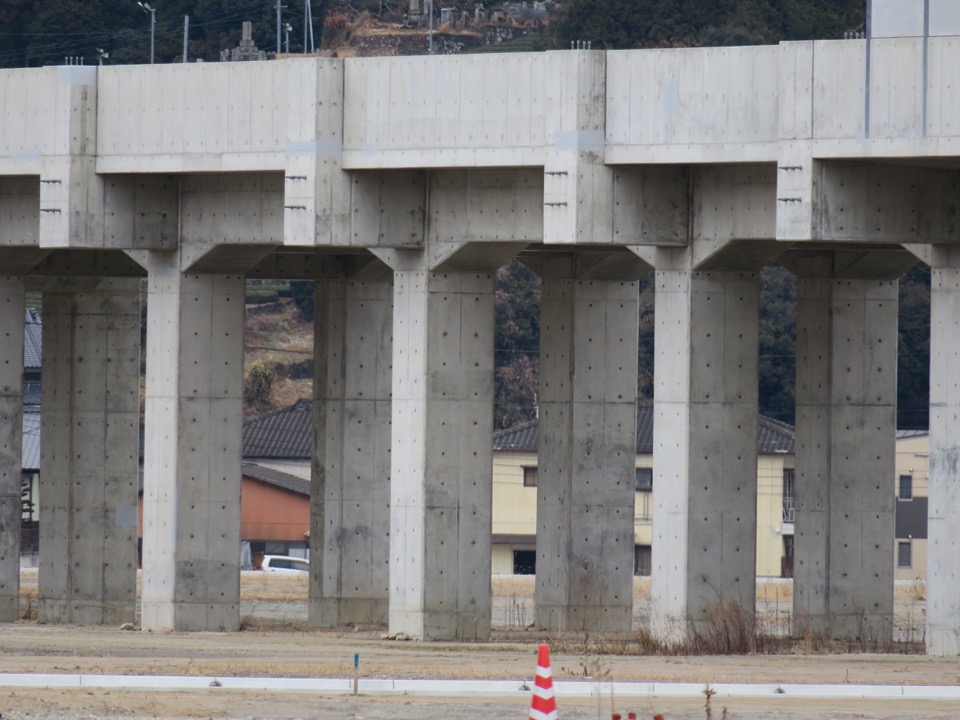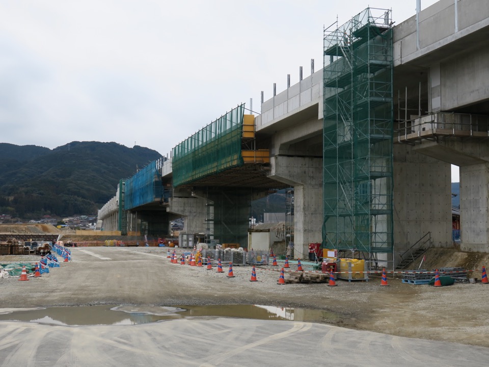 駅部の高架橋は完成していますが、駅舎部は全く手つかずです。ホームと高架橋の接続部分は、鉄筋の突起があるのでそれと分かります。 |