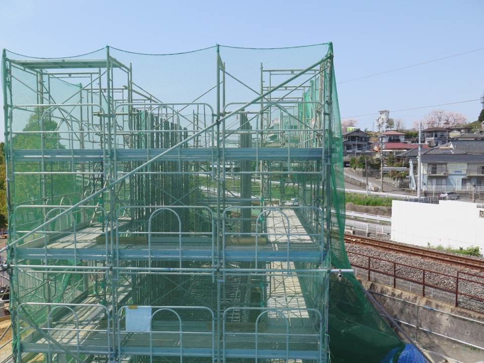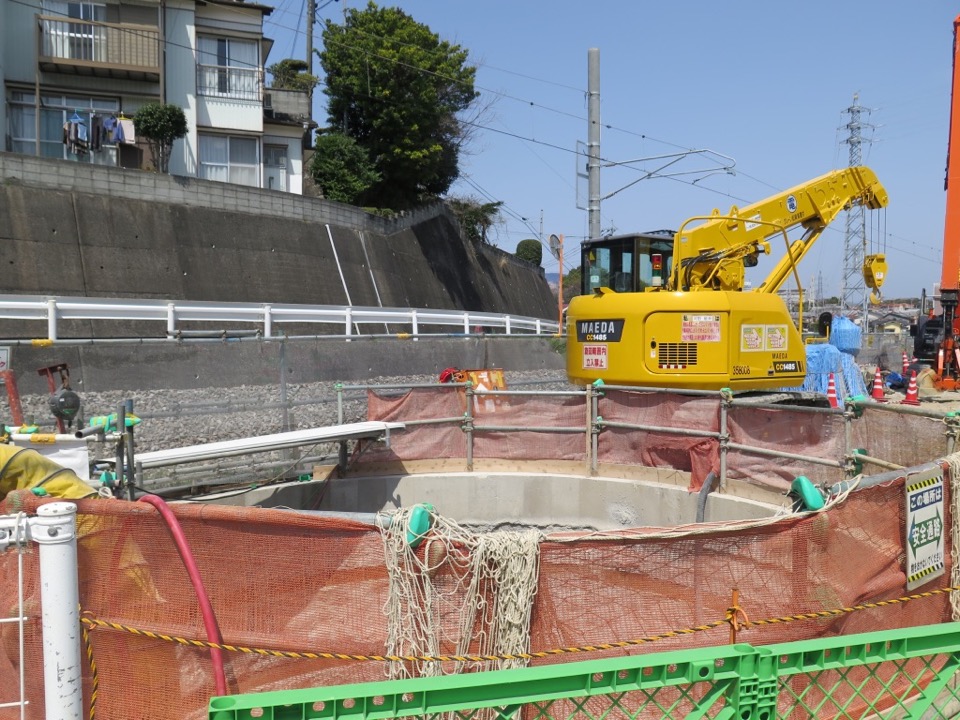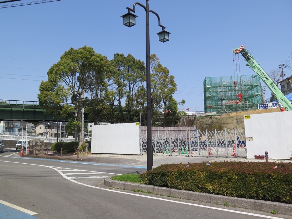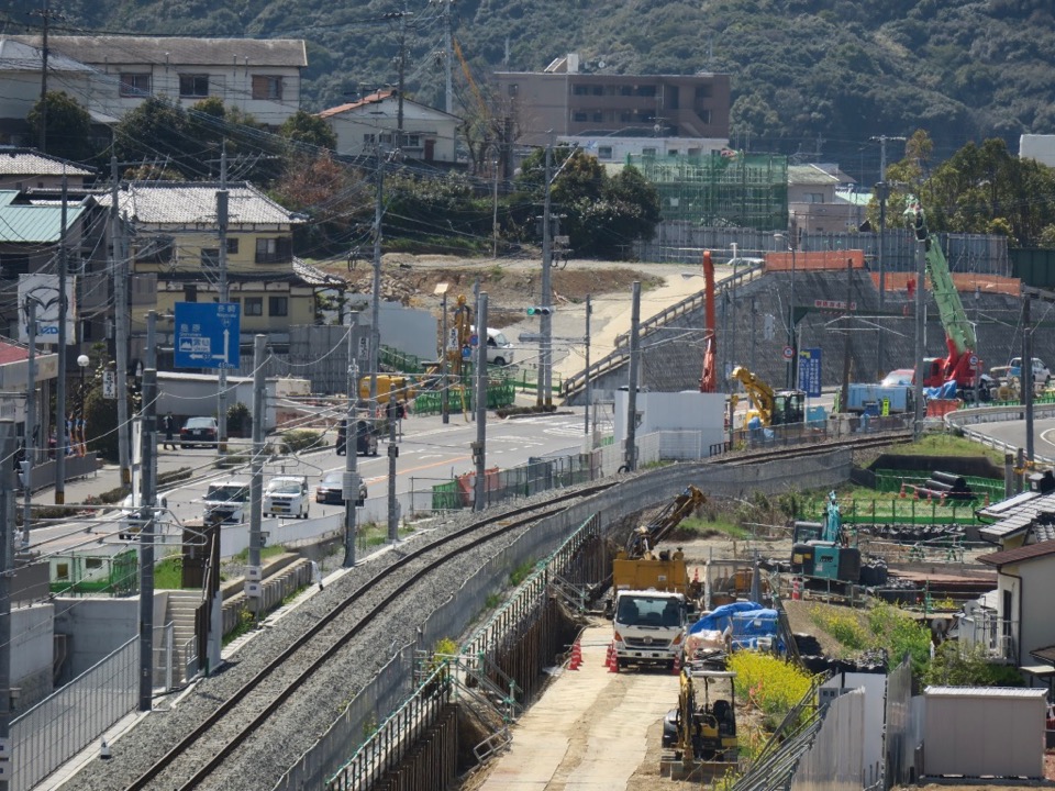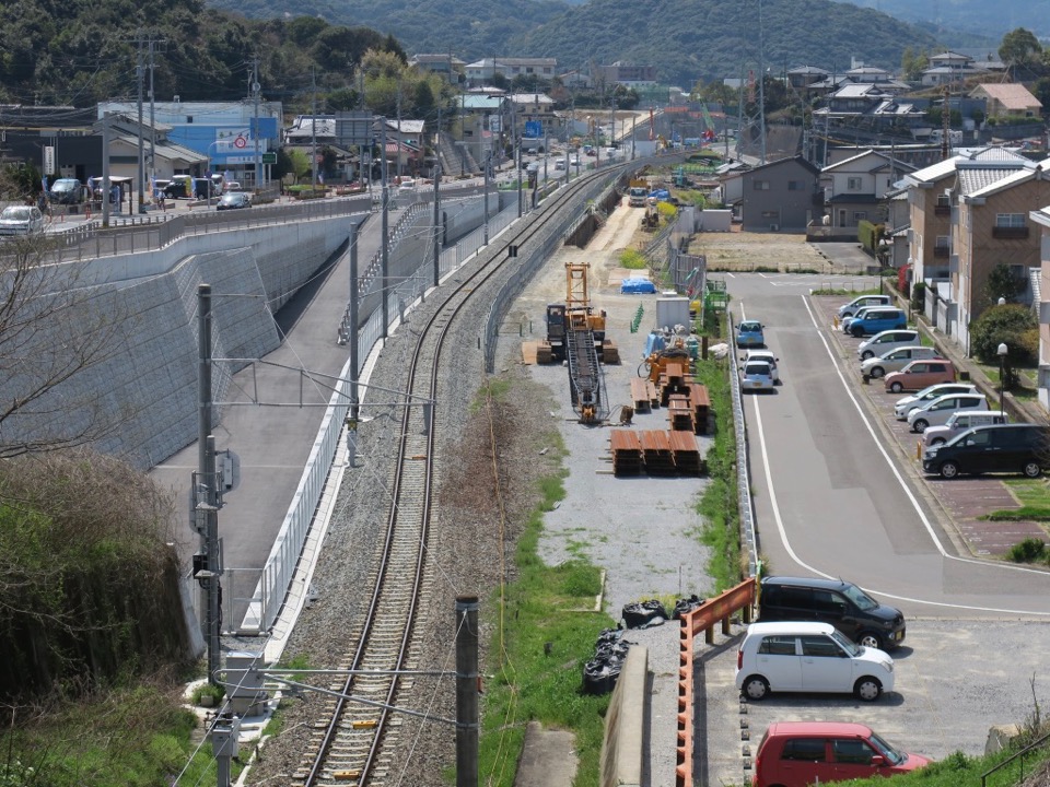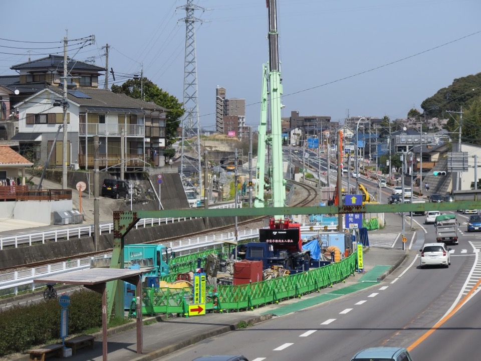 長崎線上りと国道34号線をオーバークロスする地点です。現在、橋脚工事が行われています。 |