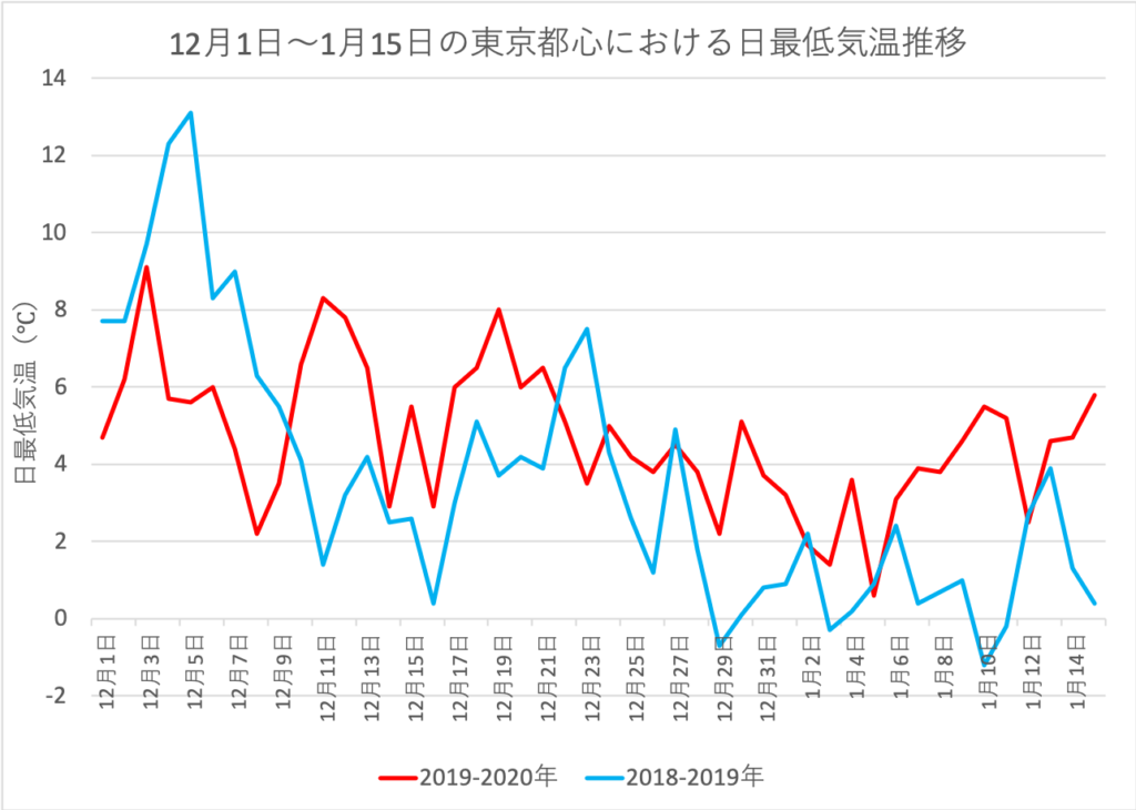 1月も終わり。東京における1月の日最低気温を、昨年とざっくり比較した。