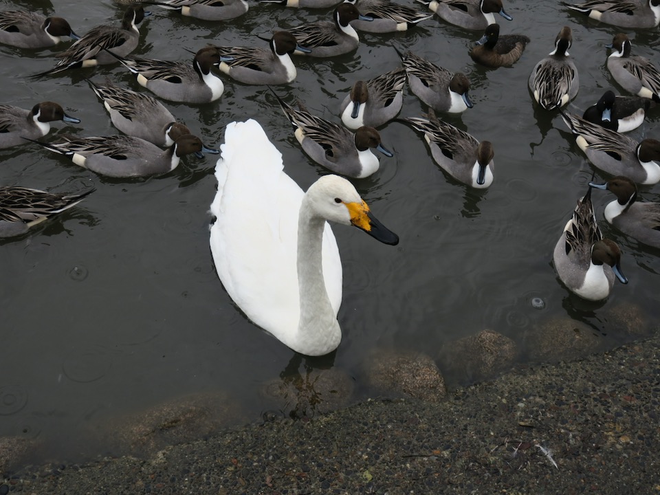 ご覧のように、ハクチョウも他のガン・カモ類(写っているのはオナガガモが多い)も、人が近づくと寄ってくる。餌付けするのは野生動物との好ましい関わり合い方ではない、と今では誰もが理解していると思うが、昔はそんな不適切事例が教科書に載ってしまったわけだ。
