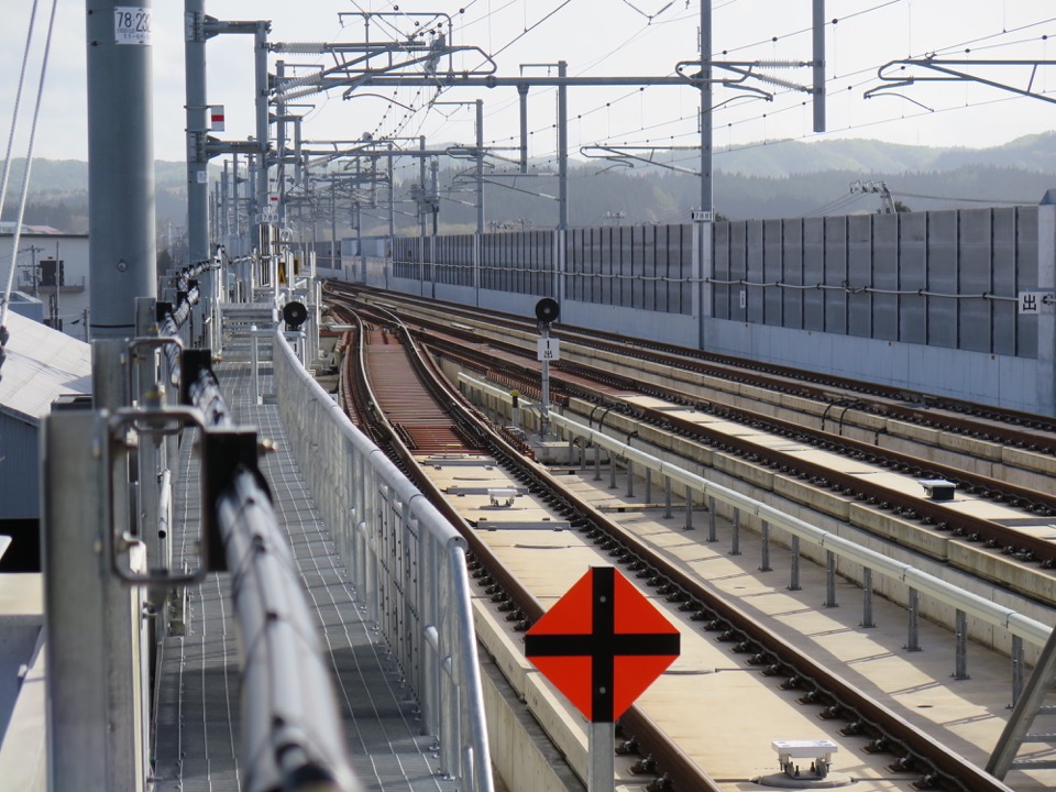 上りの東京方に、本線と副本線が合流する分岐器があります。上り副本線へは、下り本線からも入線できる配線です。