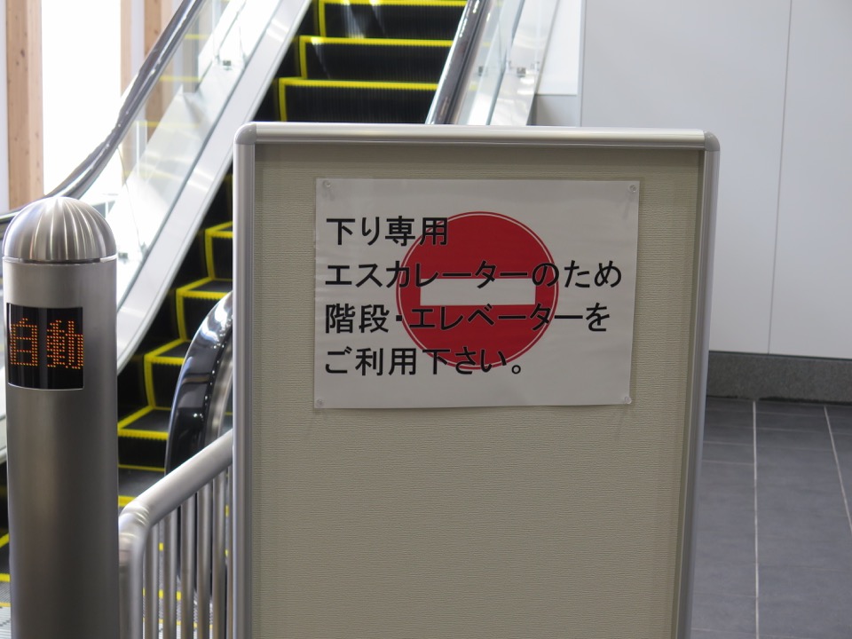下りホームからのエスカレーターは、降り専用である旨掲示されています。簡易な掲示であるのは、場合によってエスカレーターの作動方向を変える可能性があることを示唆しています。