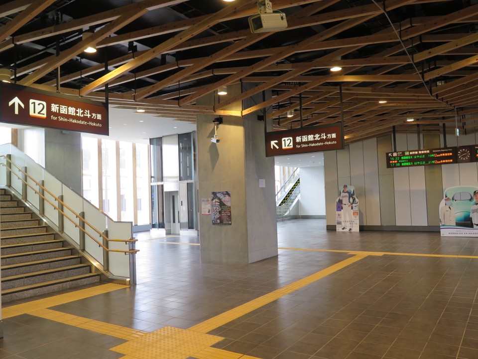 改札に近い方から、階段・エレベーター・エスカレーターの順に設置されています。階段は、線路と直交する向きでコンコースに据え付けられ、途中で90°曲がってホームとつながります。駅が2面3線構造であり、そこそこの幅があるため、このような構造が可能です。奥津軽いまべつ駅と同じく、改札内にはトイレがありません。