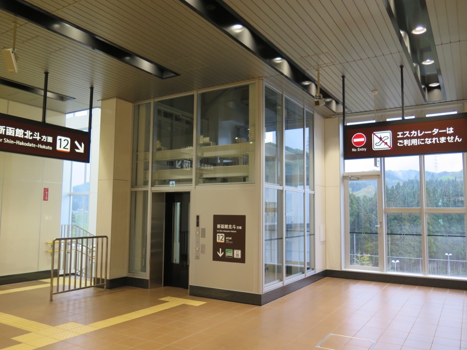 ホームから上がった改札内コンコースです。階段・エレベーター・エスカレータが見えていますが、下りホームへのエスカレーターがない旨、表示してあります。