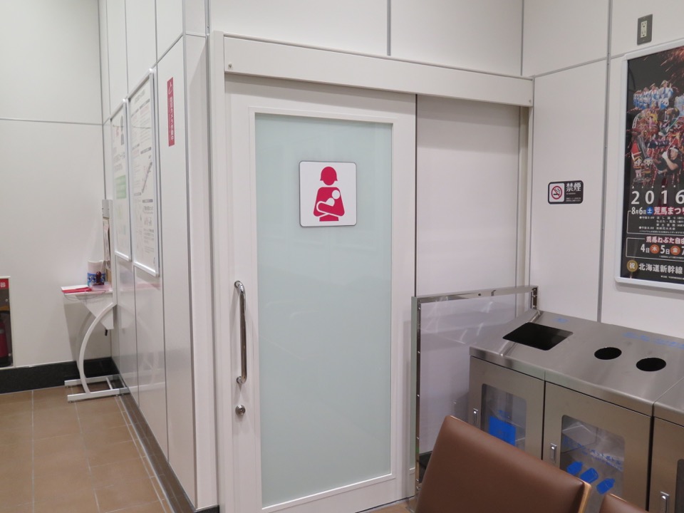改札階の待合室(出入口は改札外)。内部にはベビールームがあります。JR東日本の新設新幹線駅では標準装備≠ニなり、既設駅でも漸次設置が進んでいますが、JR北海道もそれに倣った形です。