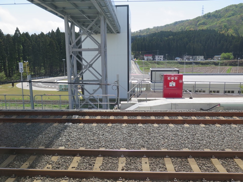 駅外に出る通路(跨線橋)を、新幹線下りホームから見ます。線路は海峡線下り本線・副本線です。