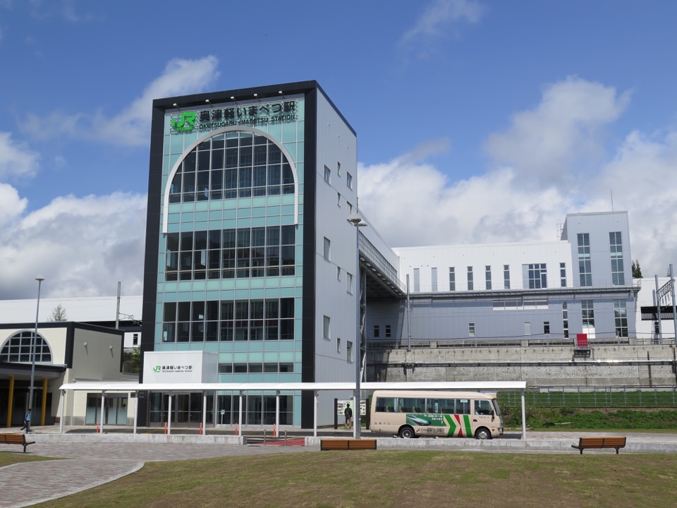 駅舎及び階段・エレベーター収納塔の全景です。駅前にはバス発着場があります。左側には、屋内外の駐車場も設置されています。