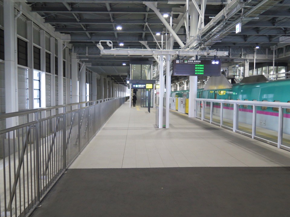ホームドアがあり、一部は透明で列車が見えるようになっています。ホームを挟んで反対側には柵が立ち上がっています。