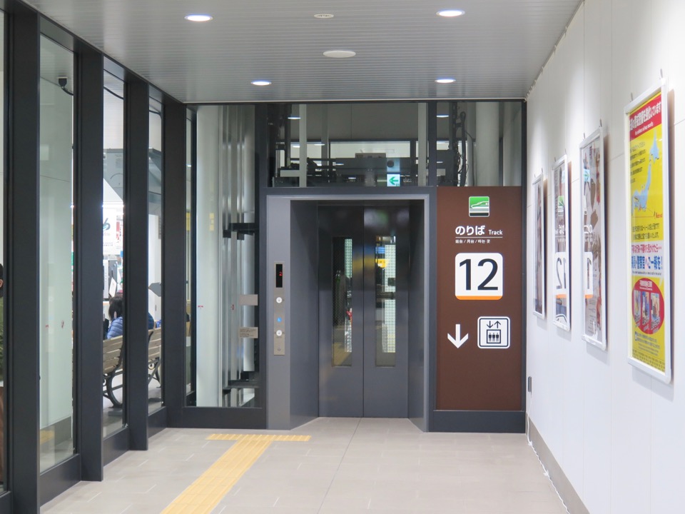 エレベーター昇降口。後方がエスカレーターになります。左側に、改札内コンコースへ出るドアがあります。