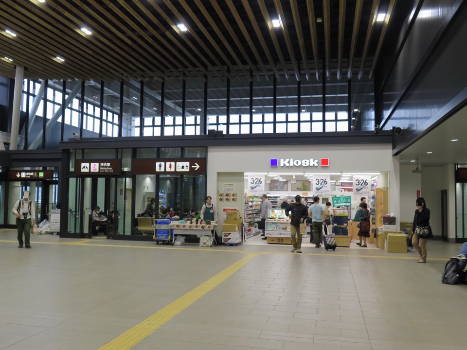 改札内コンコースの東京方を見ています。左から、11番線への階段・待合室・売店・12番線への階段・トイレが並んでいます。後方が札幌方で、各改札口になります。