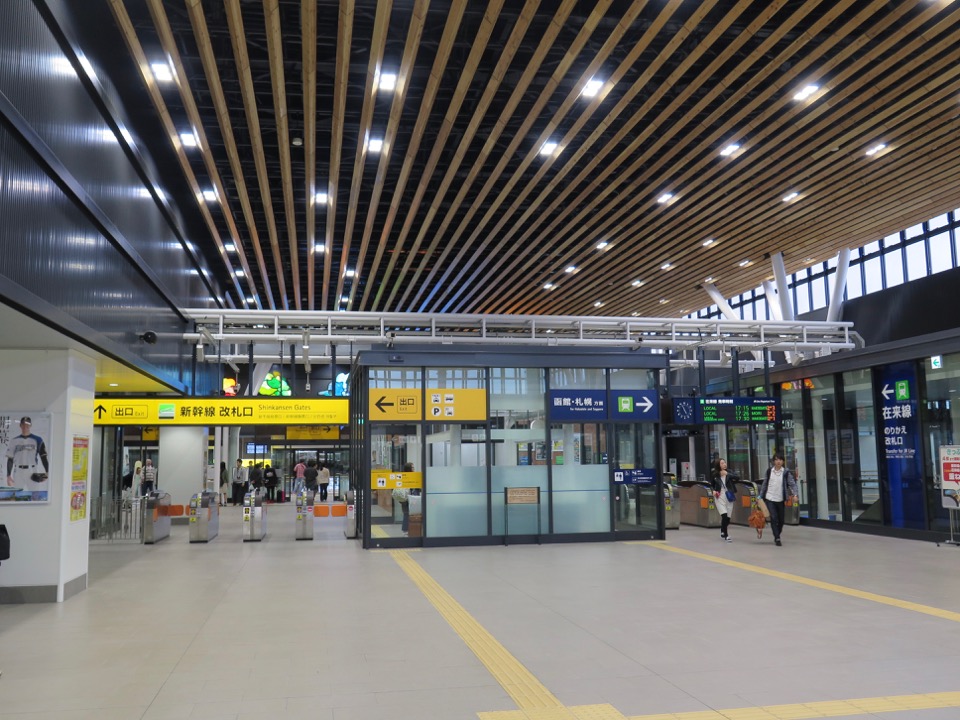改札内コンコースの札幌方を見ています。左に自由通路への出口改札・右に乗り換え改札が位置しており、中央にそれぞれの有人通路兼精算所があります。