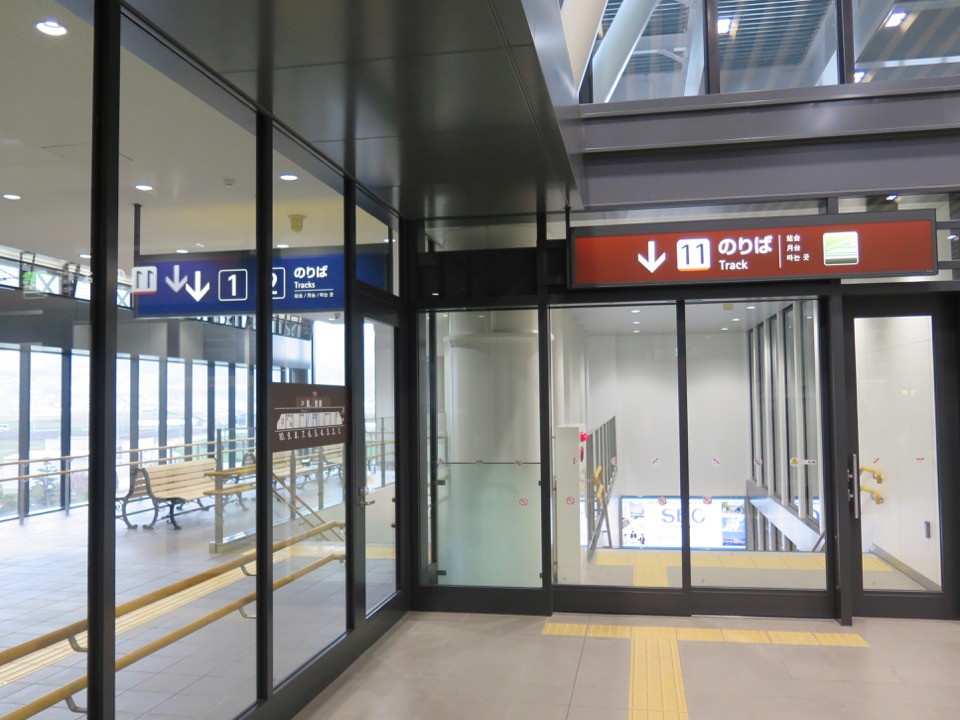 新幹線改札内コンコースの東京方には、各ホームへの階段があります。ドアで仕切られた11番線への階段が見えますが、ガラスで仕切られた左側が、在来線乗り換え通路です。