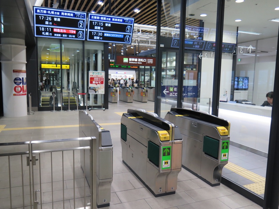 2階在来線改札口。入場して左に進むと在来線への通路です。向こうに見えるのは、新幹線改札内コンコースへの2階中間改札・正面のエスカレーターは、新幹線上り11番線へのものです。
