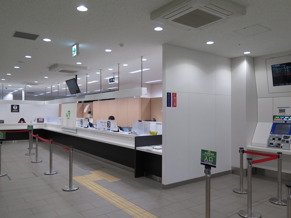 出札窓口(みどりの窓口)です。自由通路側から、手前が指定券自動券売機・奥が有人窓口になります。