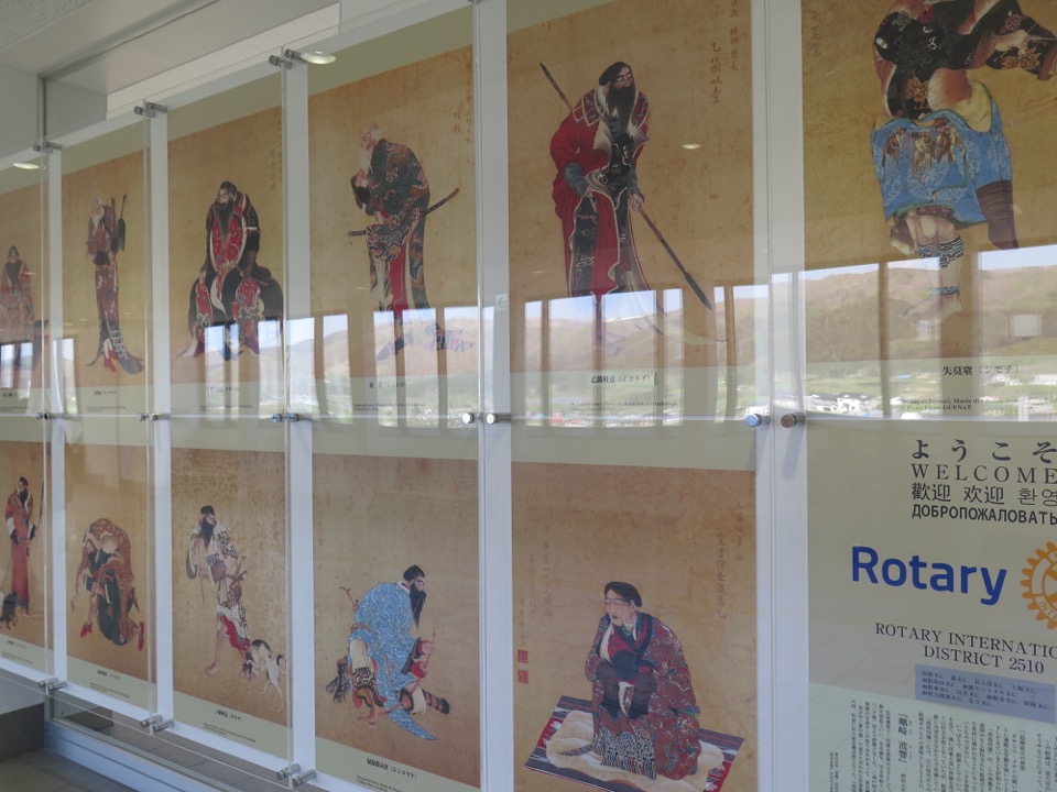 2階改札の北側に展示された「夷酋列像」壁画。オリジナルは、道東のアイヌ有力者を、松前藩家老・蠣崎波響が江戸時代後期に描いたもの。