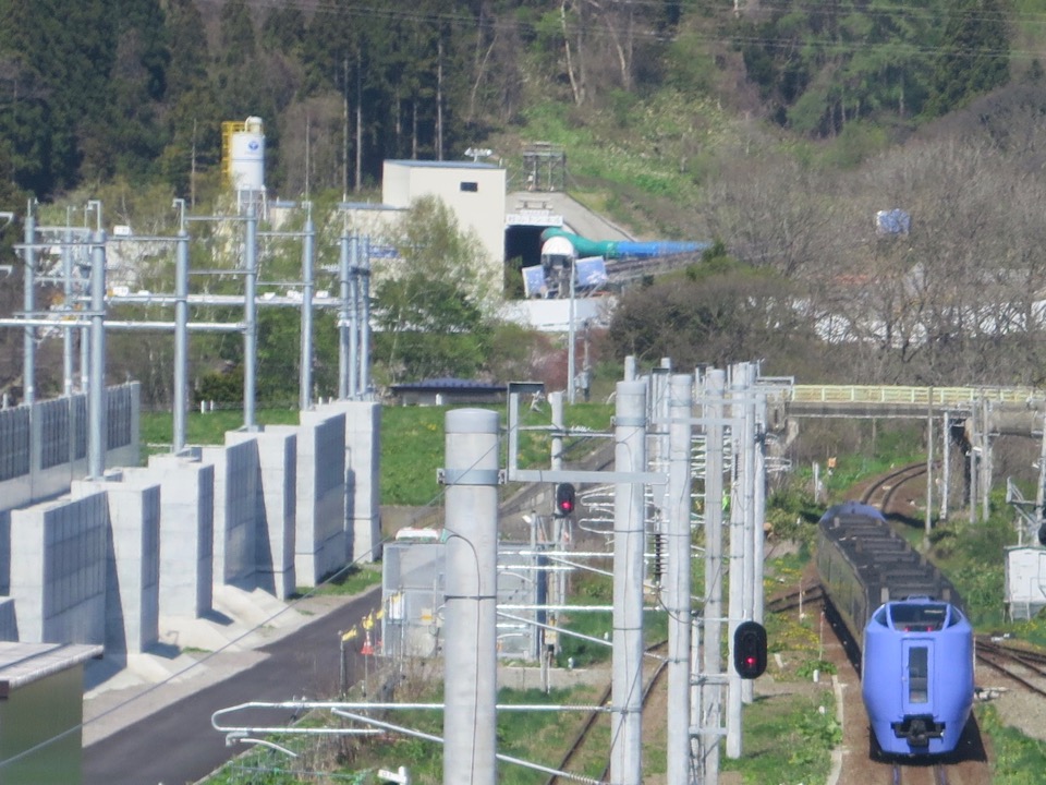駅の札幌方。終点の先では、札幌へ向けての延伸工事が始まっている。新函館北斗〜新八雲(仮称)間で最初のトンネルとなる村山トンネルの掘削工事が進む。