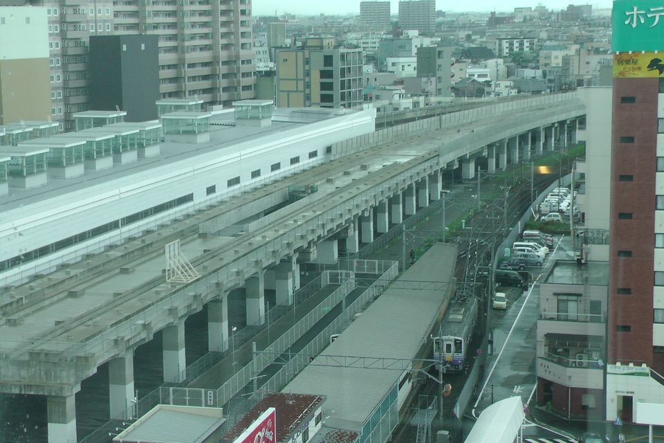 アオッサから。左(西)から、北陸本線・新幹線・えちぜん鉄道となっている。