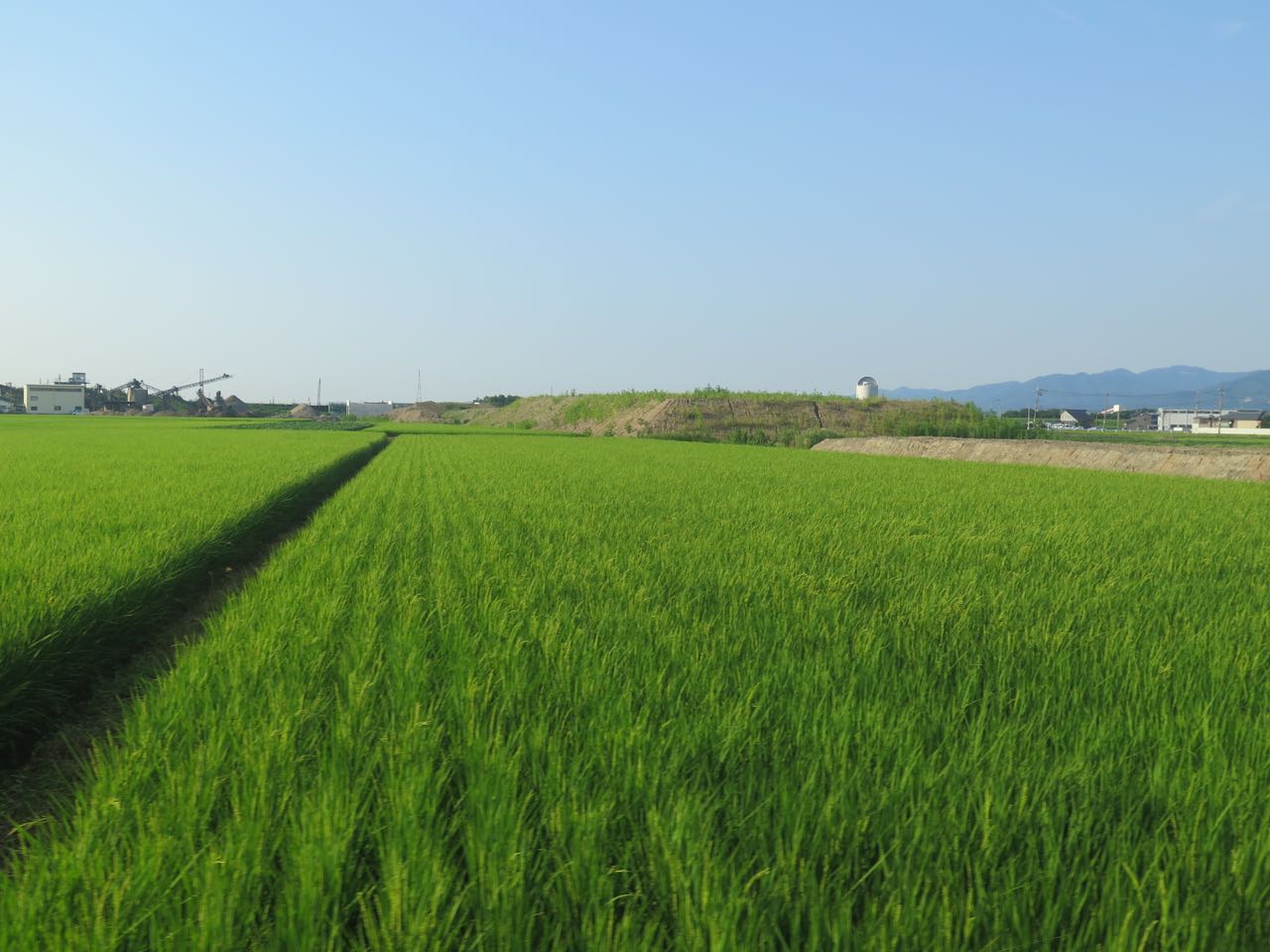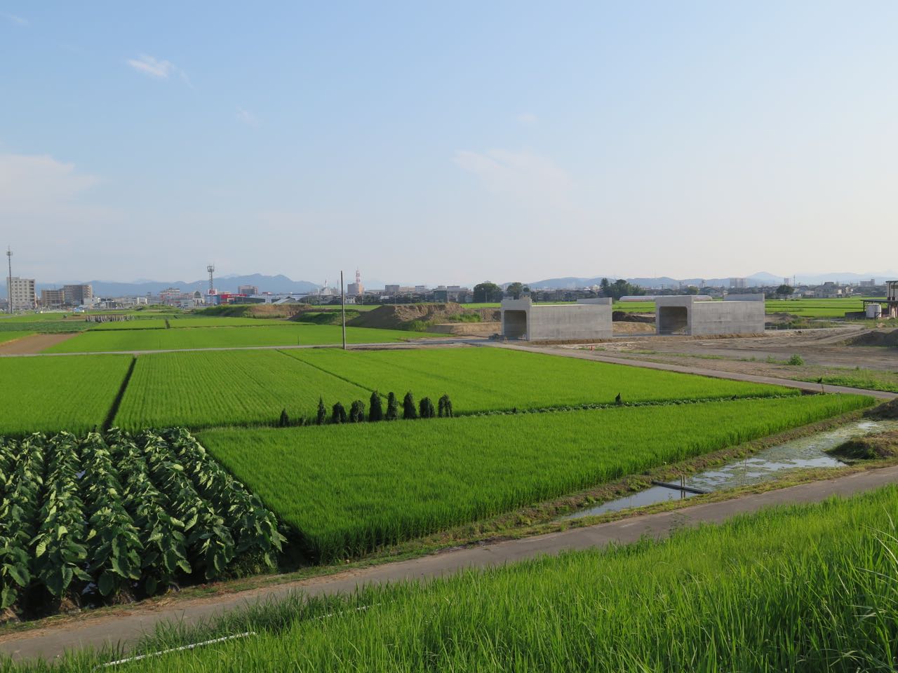 九頭竜川の堤から南側を望む。その向こうは福井市街地です。九頭竜川橋梁と同じく、整備中の道路と一体構造が採用された区間です。