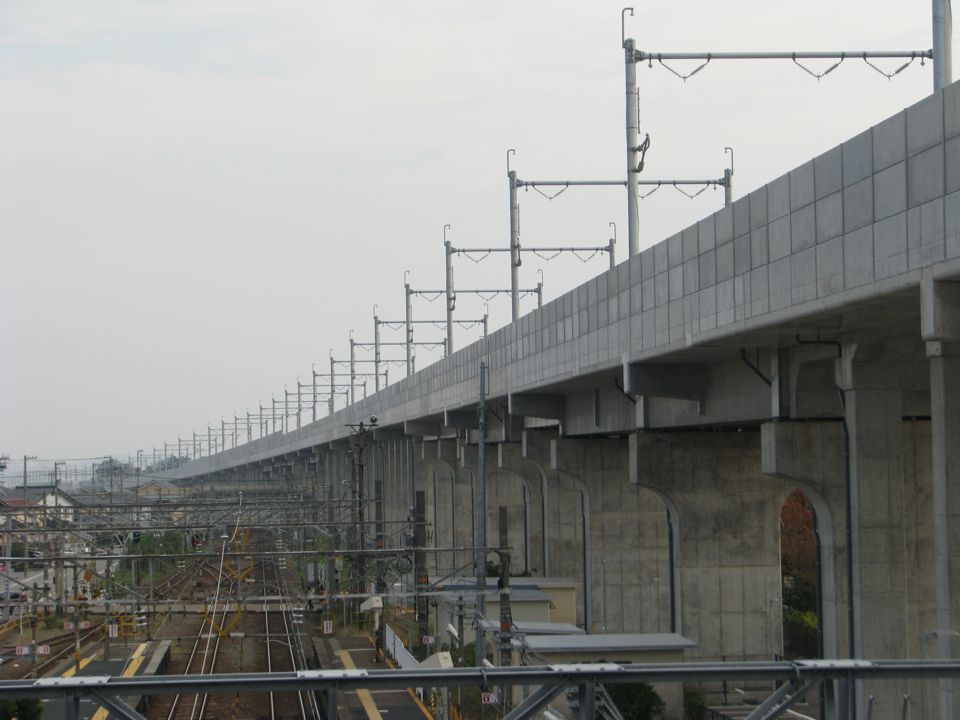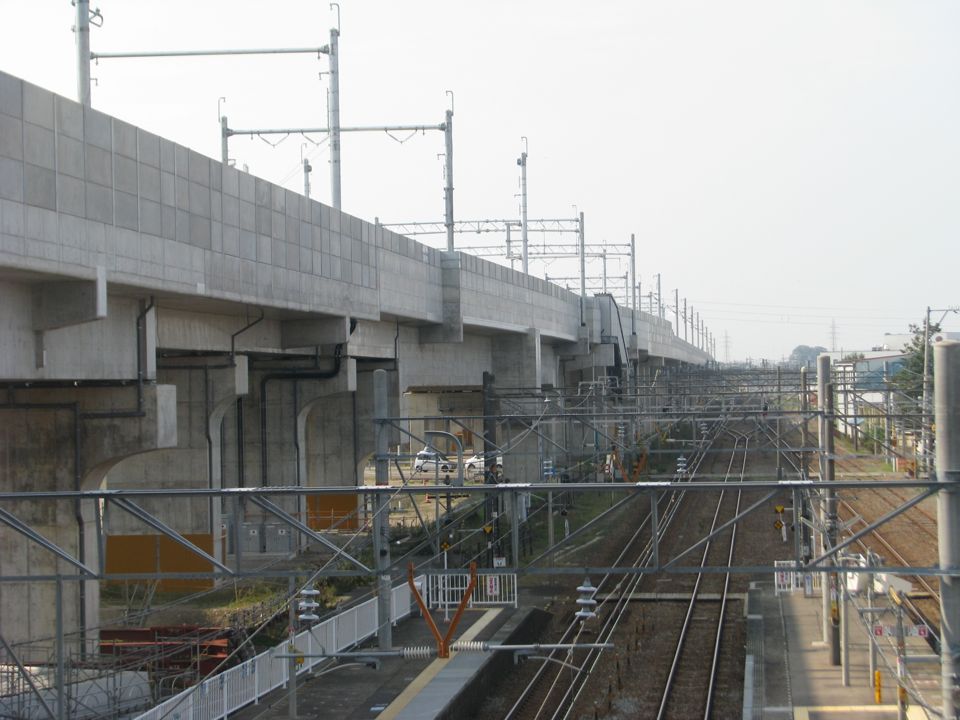 | 上り回送線(右)は本線(左)とかなり離れる部分があります。これは、この先(写真奥・南西側)で回送線が本線の下を潜るのですが、ここが曲線区間であり、回送線が本線の右から回り込むことで、容易に橋脚間に線路を通すことができる設計にしたためだと思われます。 |