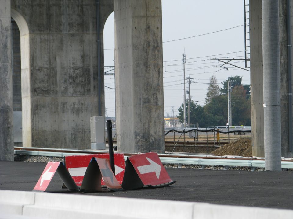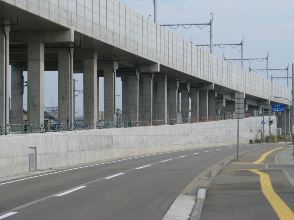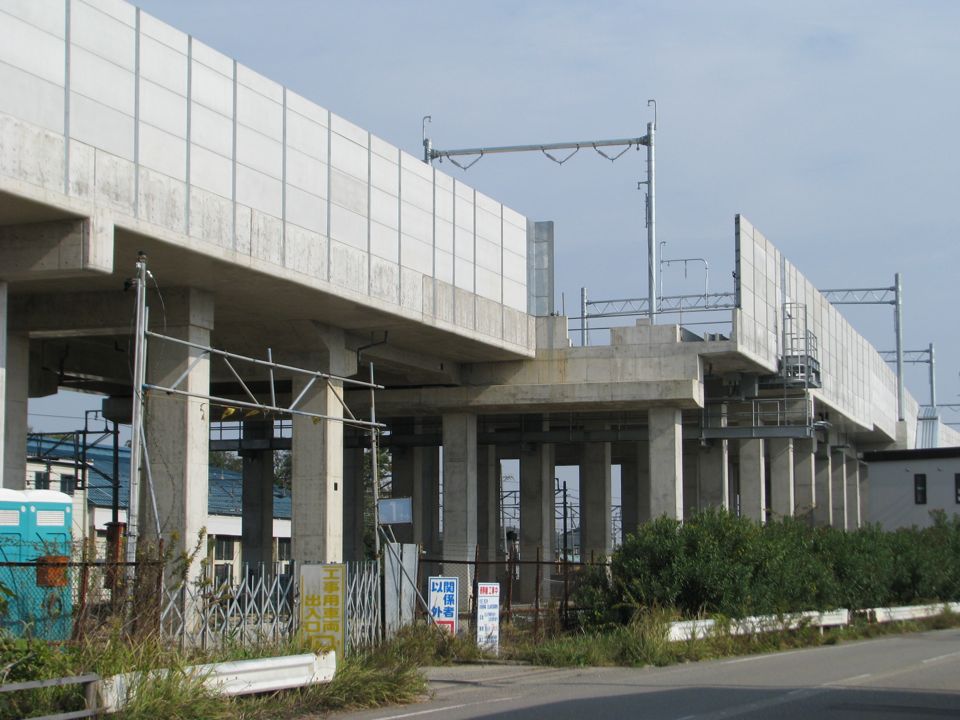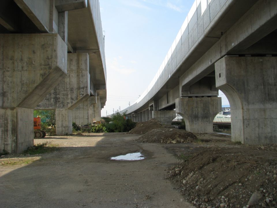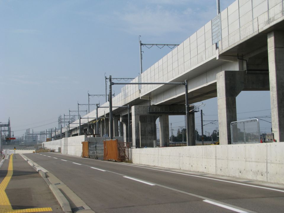 | 本線高架橋(白山成町高架橋)の大阪方終端部分です。松任駅近くに挿入される回送線分岐器付近から、1.6kmも大阪寄りになります。ここには当面、列車が通る予定はないものの、終端間際近くまで架線柱が建てられているのが印象的です。 |