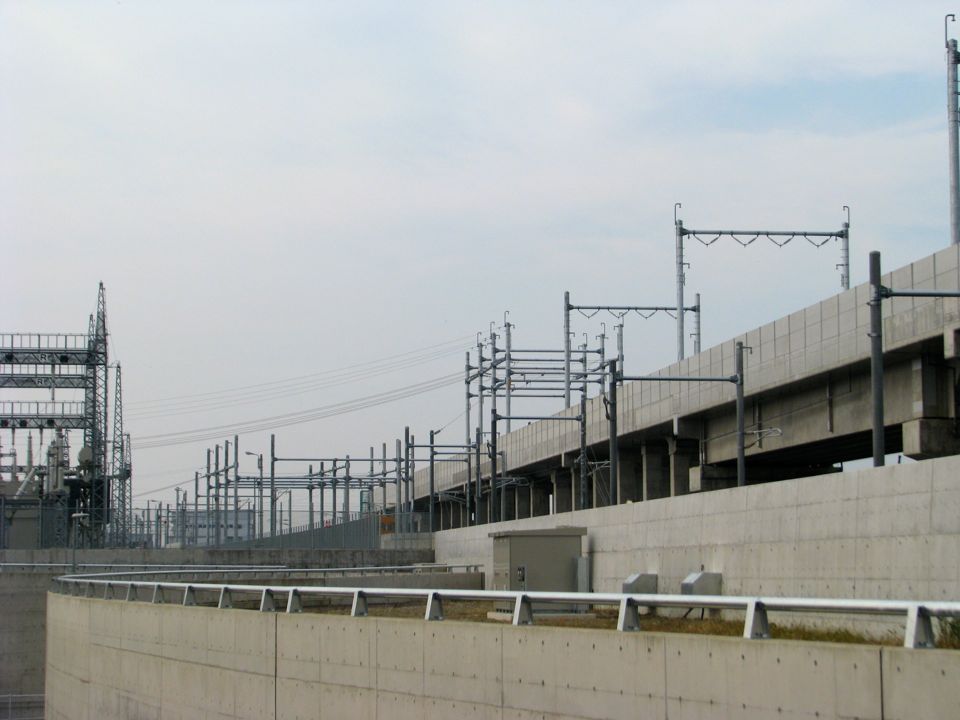| 回送線が本線から離れ、車両基地の入出庫線に連なるところです。新白山変電所が左端に見えています。 |
