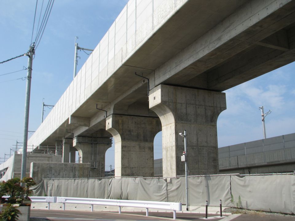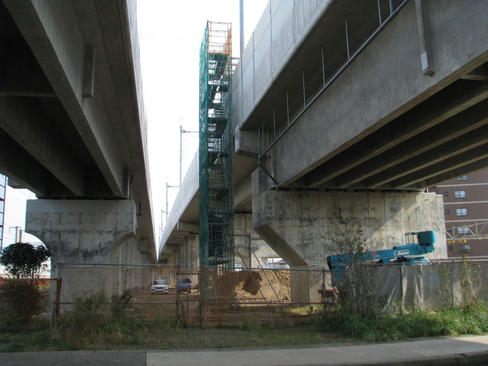 | 上り回送線が本線高架橋の橋脚間をすり抜ける箇所です。橋脚間に架線ハンガーが見えます。 |