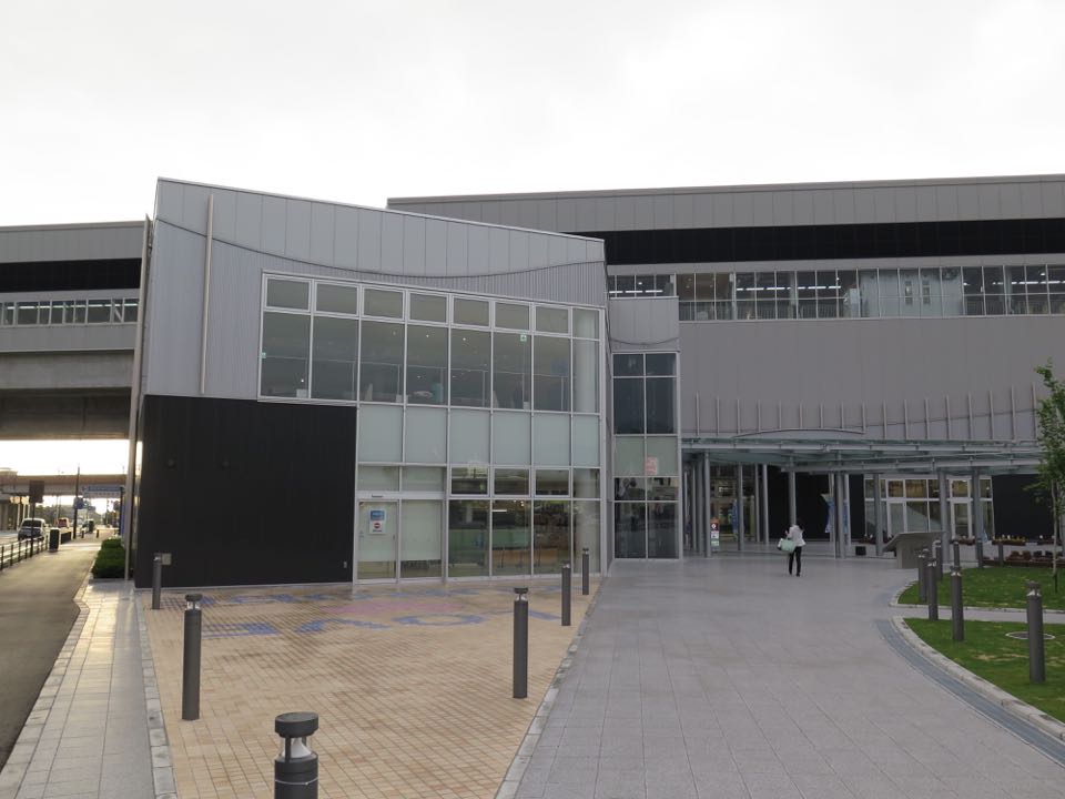 東口。手前の建物が「地域観光ギャラリー」です。その左側の県道14号沿い高架下に「南口」があり、地鉄駅への連絡口になっています。