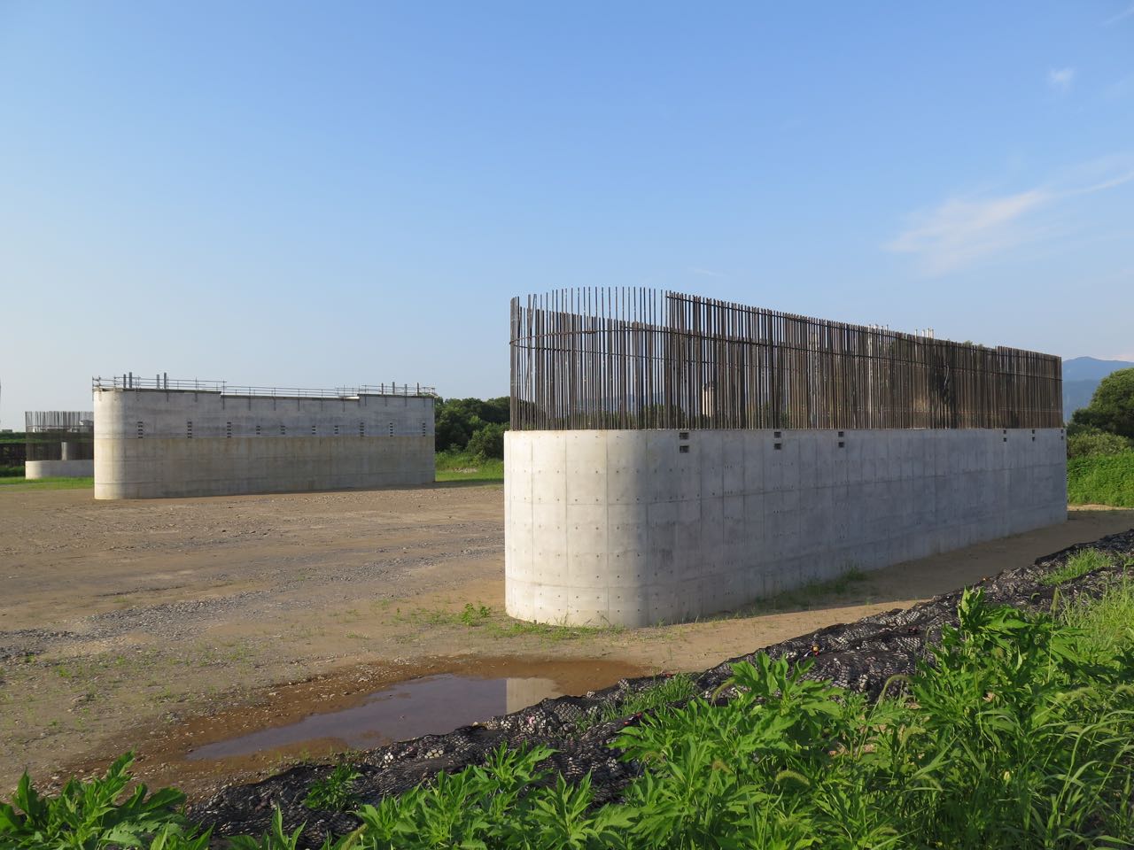 とても幅広の橋脚ですが、これは県道と一体構造にした設計のためです。両側を道路が通り、中央部を新幹線が通ります。このような施工法を採用したことにより、道路・鉄道を合計した工費の削減が可能となりました。