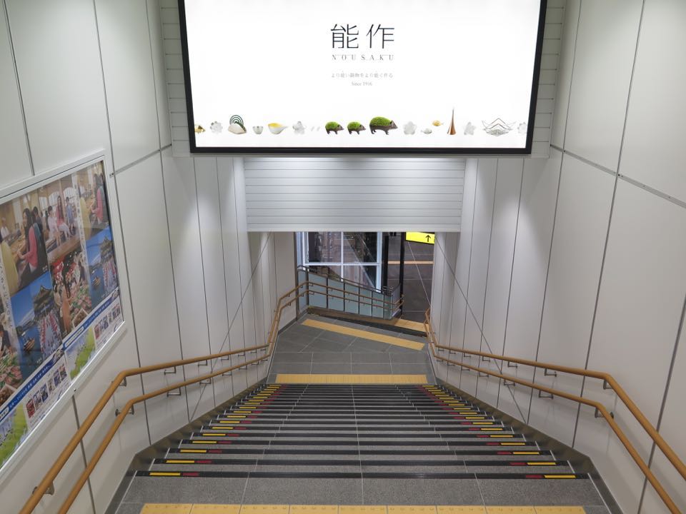 階段越しに、改札内コンコースを見下ろしています。下の方で斜めに取り付けられた階段は、九州新幹線などでも例があります。