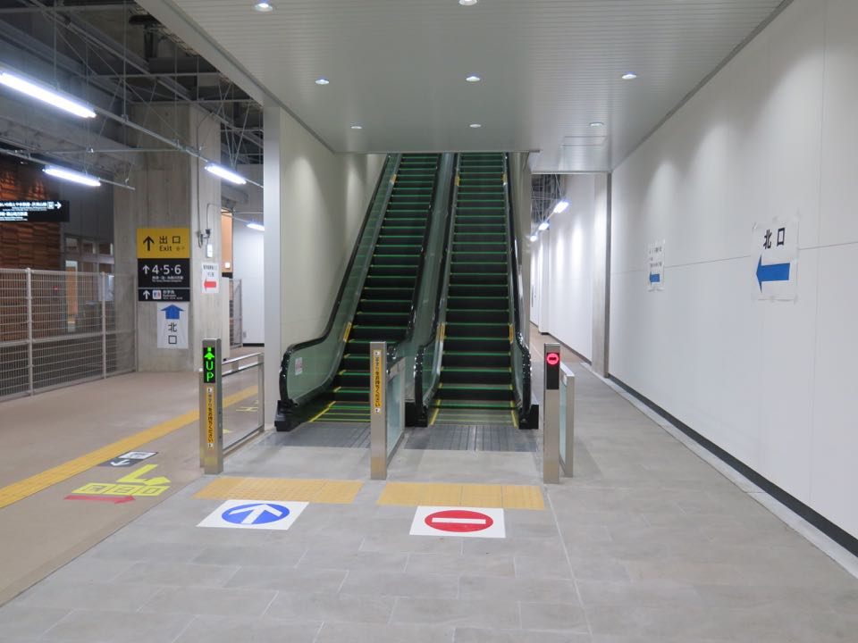 在来線の駅舎内正面改札を入り右側に回り込むと、北陸下り線・高山線ホームへ登るエスカレーターがあります。左側が東西自由通路です。「北口」へは、従来の跨線橋に登ることになります。