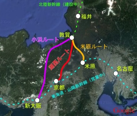 | 2 | 湖西ルート+米原ルート+琵琶湖若狭湾新線 | 北陸〜中京・関西の現行ルートを堅持して高速化 若狭への利便性も確保 |