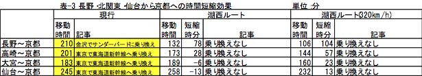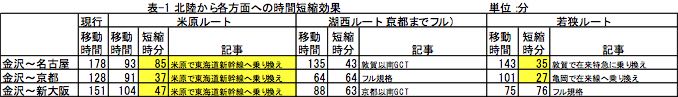 以下の表では、米原ルート=東海道新幹線に乗り換え・湖西ルート=現湖西線をGCT走行・若狭(小浜)ルート=亀岡を通過 と仮定したうえ、時間短縮効果を計算したものです。フル規格部分は260km/h走行が前提です。黄色部分は、乗り換えを伴うものです。