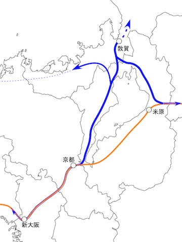 京都〜新大阪は東海道新幹線に腹付け線増(複々線化)とするか、或いは鯖街道ルート(仮)≠基本としながら、京都市街地を大深度地下で通過して現京都駅直下に北陸新幹線の駅を建設し、そのまま地下を、なるべく新大阪近くまで通し、既設新幹線と接続する案もあります。こうすれば、東海道新幹線への乗り入れに伴うダイヤや経営上の問題を回避したうえ、列車を山陽新幹線に直通運転させることも可能になります。建設費は大きくなりますが、それだけの価値はあるはずです。