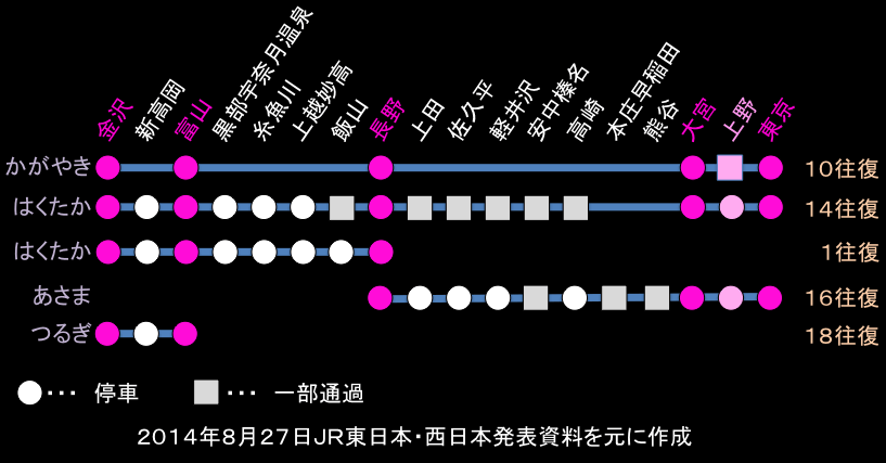 北陸新幹線の愛称別運転本数及び停車パターン(2015年3月14日開業時)