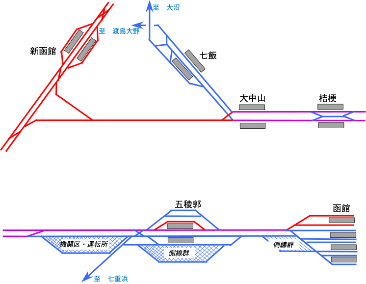 現函館へのミニ新幹線乗り入れの為の各駅配線案 赤:標準軌道、青:狭軌、紫:三線軌。 側線群は省略してある。藤代線・砂原線が分岐する七飯駅の配線を複雑にせず、かつもっとも在来線に近い場所にアプローチ線を取り付けるとすれば大中山〜七飯間となる。アプローチ線の延長はやや長く、2km程となる。沿線の大半は水田である。 現在、大中山駅は単純相対式2面2線であり、桔梗駅も同じだが、後者には撤去された中線がある。貨物列車待ち合わせのため、これを復活させている。五稜郭駅・函館駅には、側線が数多く、使用されていない部分も少なくないと考えられる。五稜郭の運転所や、海峡線への分岐をなるべく複雑にしないように、五稜郭以南では、標準軌は東側に設置することを基本とする。 |